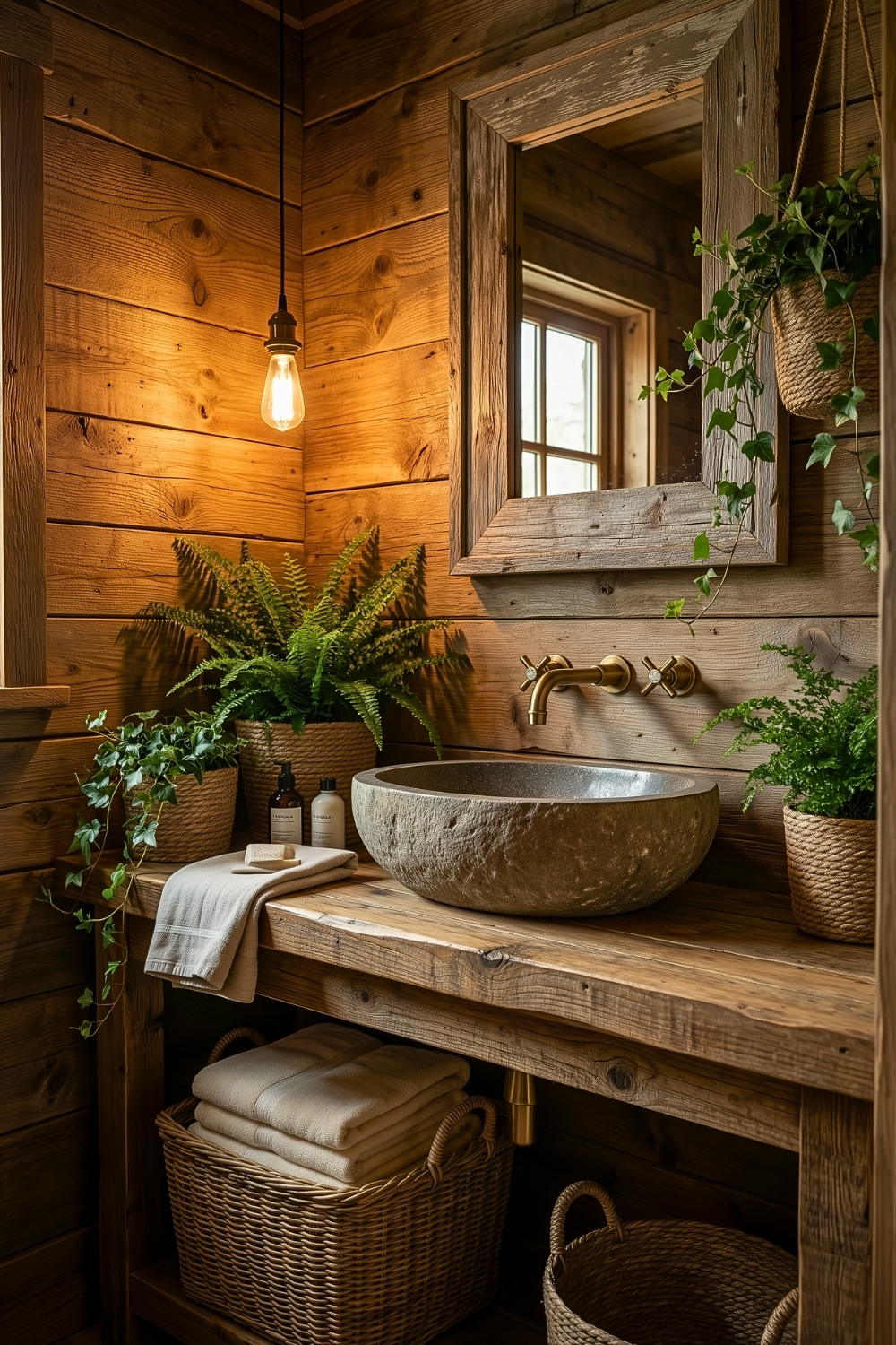I find that adding life to a wood-heavy room is as simple as bringing in a few lush ferns and an organic stone sink. This specific design creates such a soulful interior inspiration, making the vanity feel less like a utility and more like a curated corner of a peaceful mountain home. The way the warm pendant light hits the rough texture of the wood makes me want to slow down and enjoy every second of a simple morning routine.
