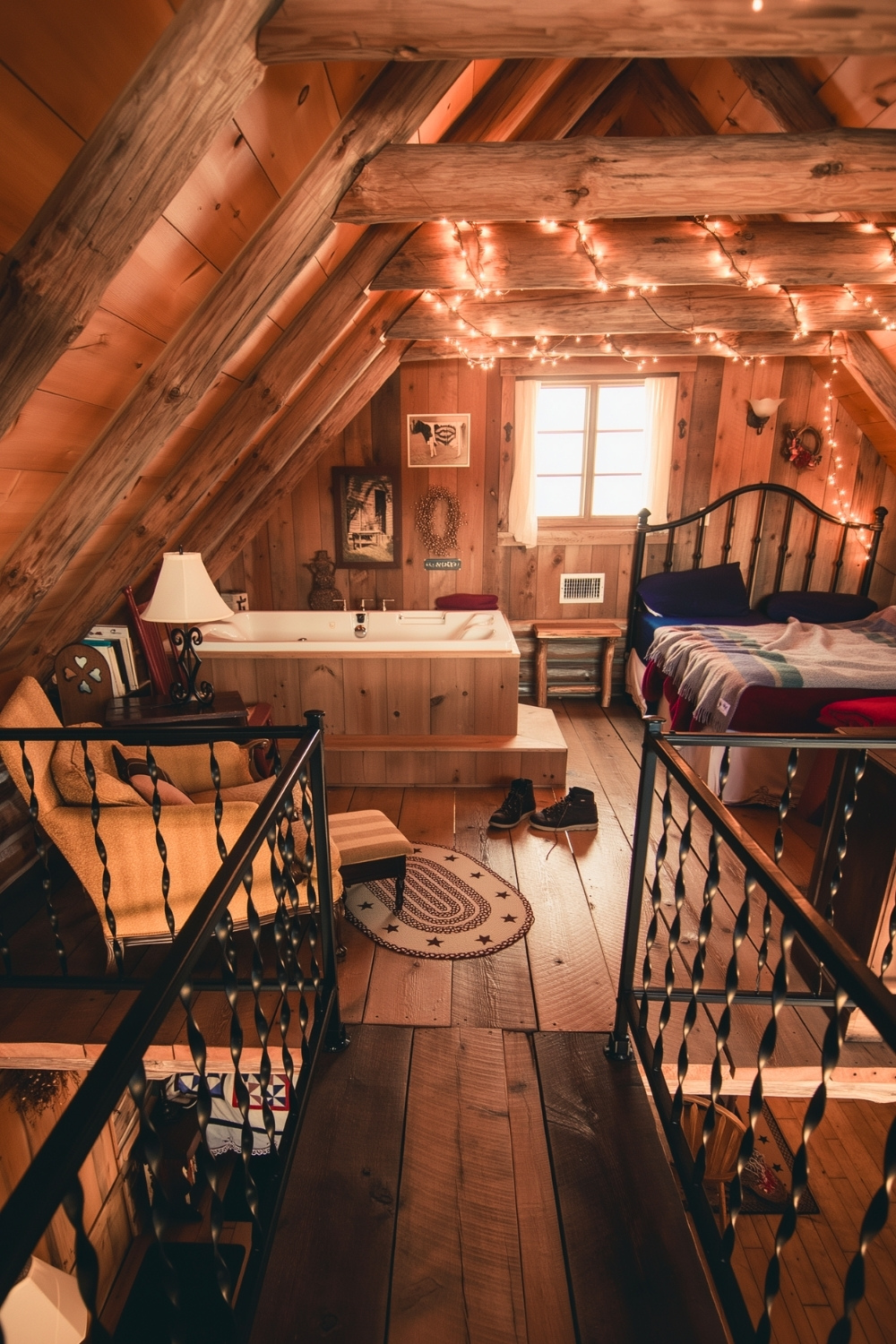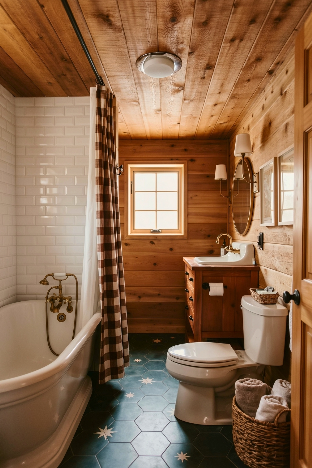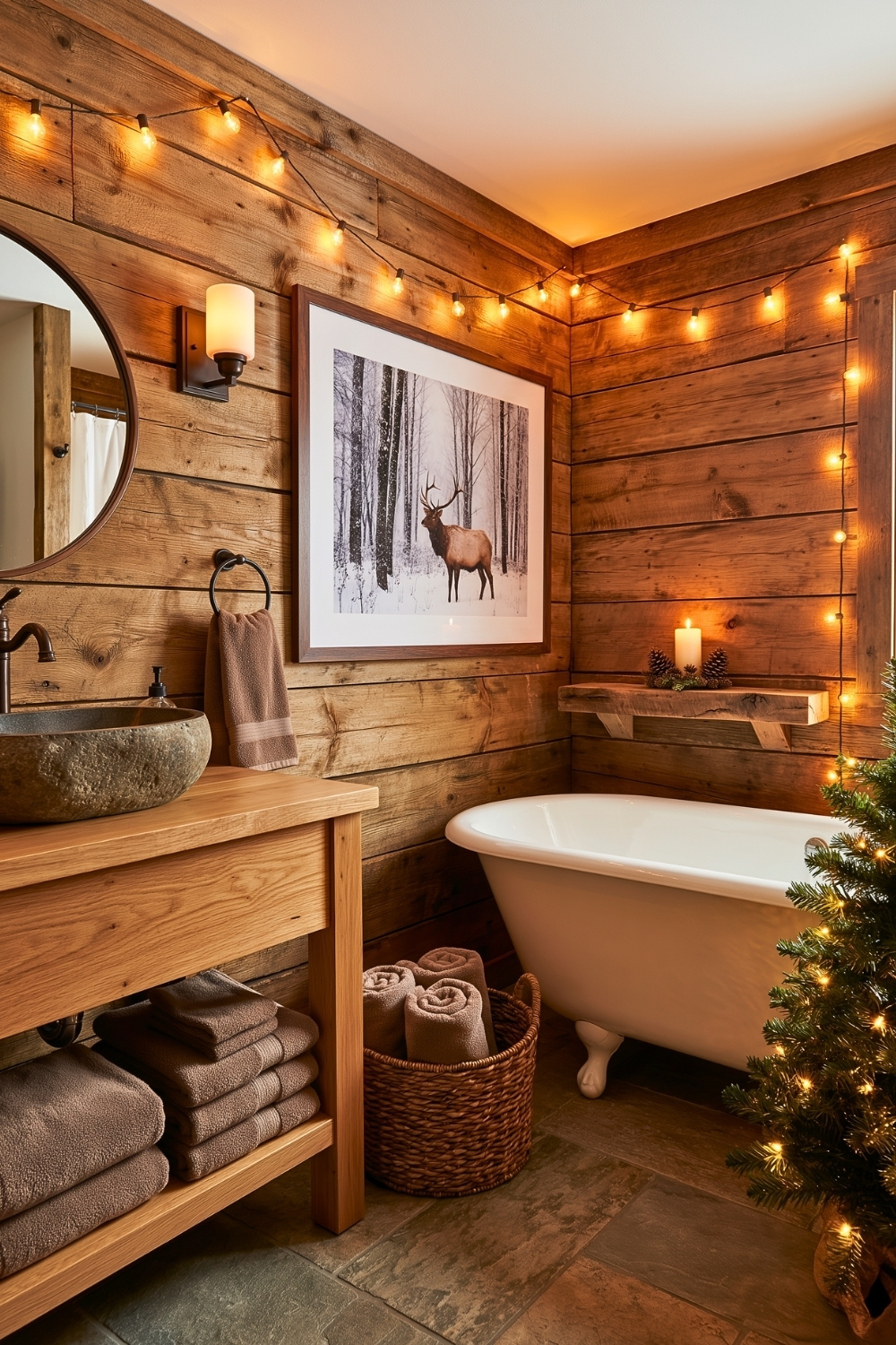 This bathroom feels like a winter retreat all on its own. The vintage tub paired with warm lights and wood walls creates that slow, peaceful vibe I always associate with quiet cabin mornings. I can imagine soaking here while snow falls outside, which honestly makes this design feel timeless and personal.