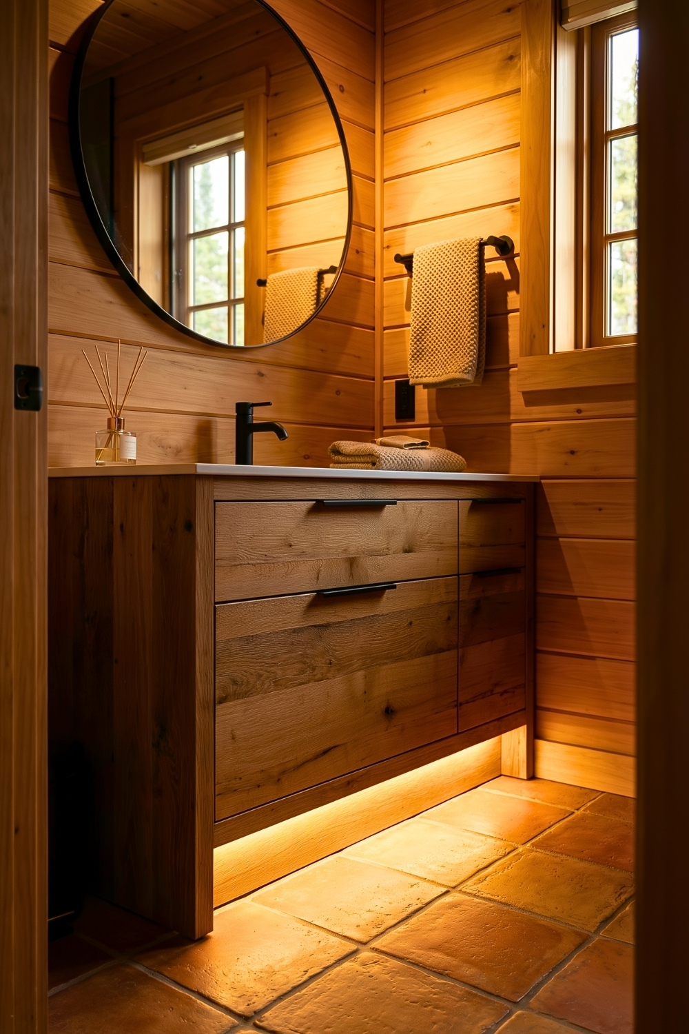Sometimes, a more modern approach can make a small interior feel incredibly chic and spacious without losing that rustic soul. I’m particularly drawn to how the under-vanity lighting creates a warm glow against the terracotta floor tiles and the soft wood grain of the cabinets. Adding a large round mirror is such an easy way to break up the horizontal lines of the wood walls while making the entire layout feel brighter and more open.