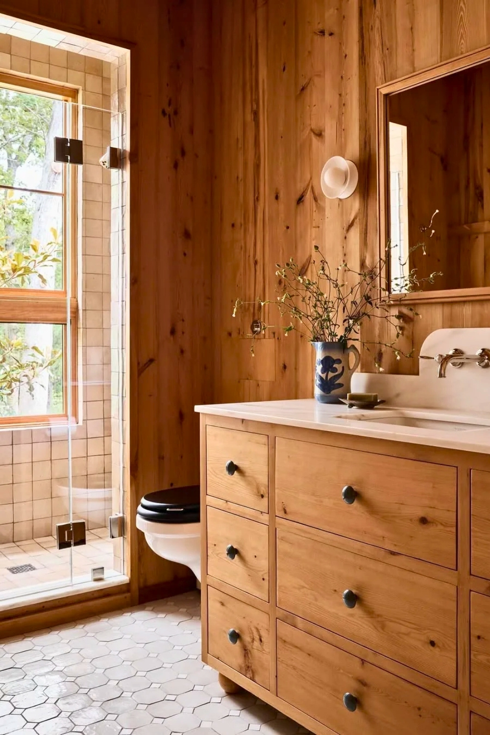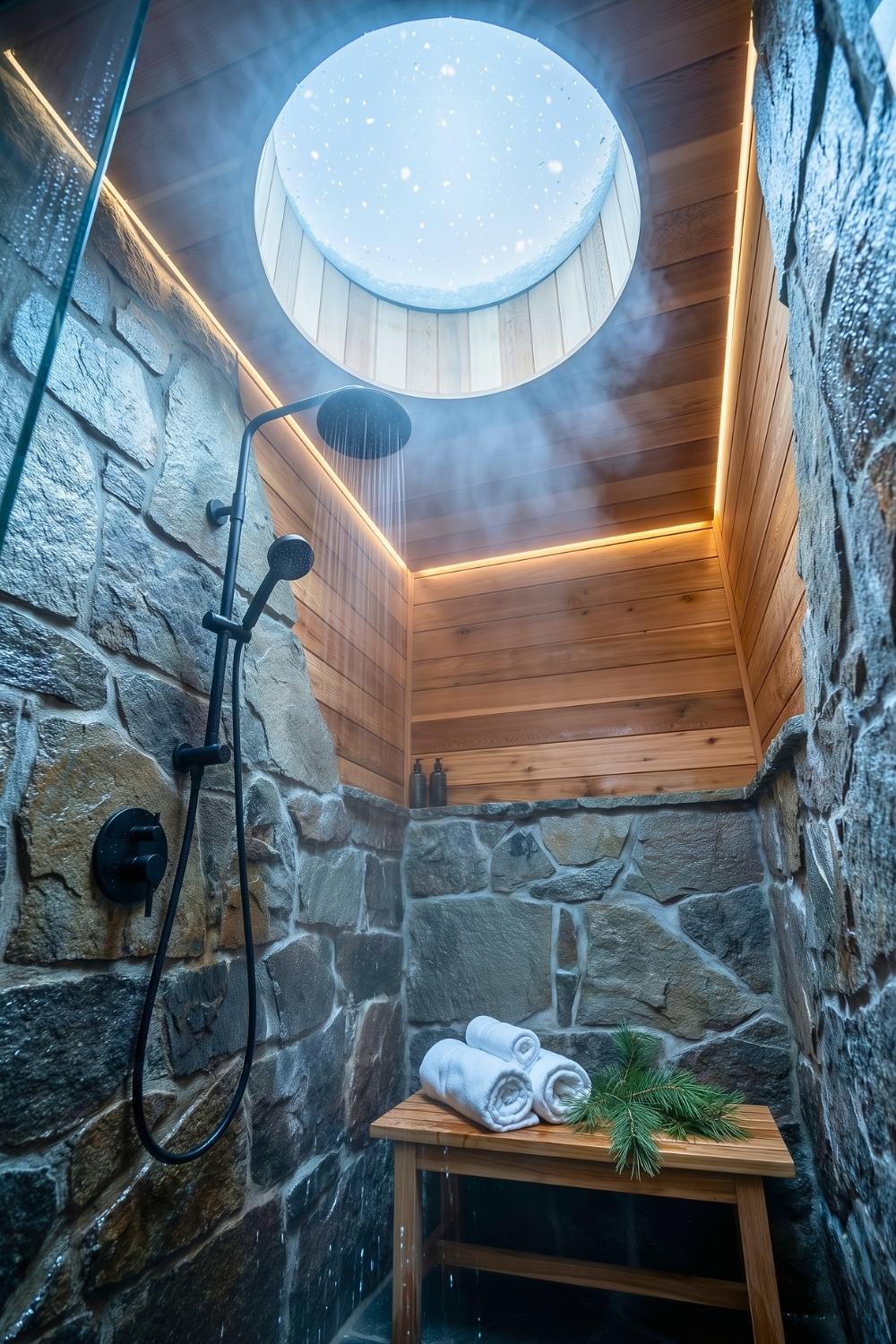 If you are planning a master renovation, I highly recommend considering a circular skylight above the shower to maximize that natural lighting. There is something so restorative about watching a winter sky while surrounded by warm cedar walls and rising steam. This kind of modern-rustic layout turns a simple daily routine into a high-end spa experience right in your own tiny home.