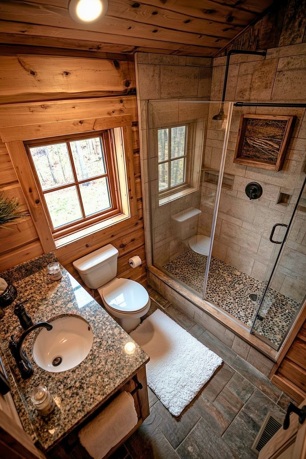 This specific blend of modern and rustic really hits the mark when it’s done right. By using a glass shower and stone tile floors alongside a wood interior, the space stays practical without losing its cabin soul. I love how the natural light makes the layout feel open and airy, even though it’s clearly designed for a more compact home.