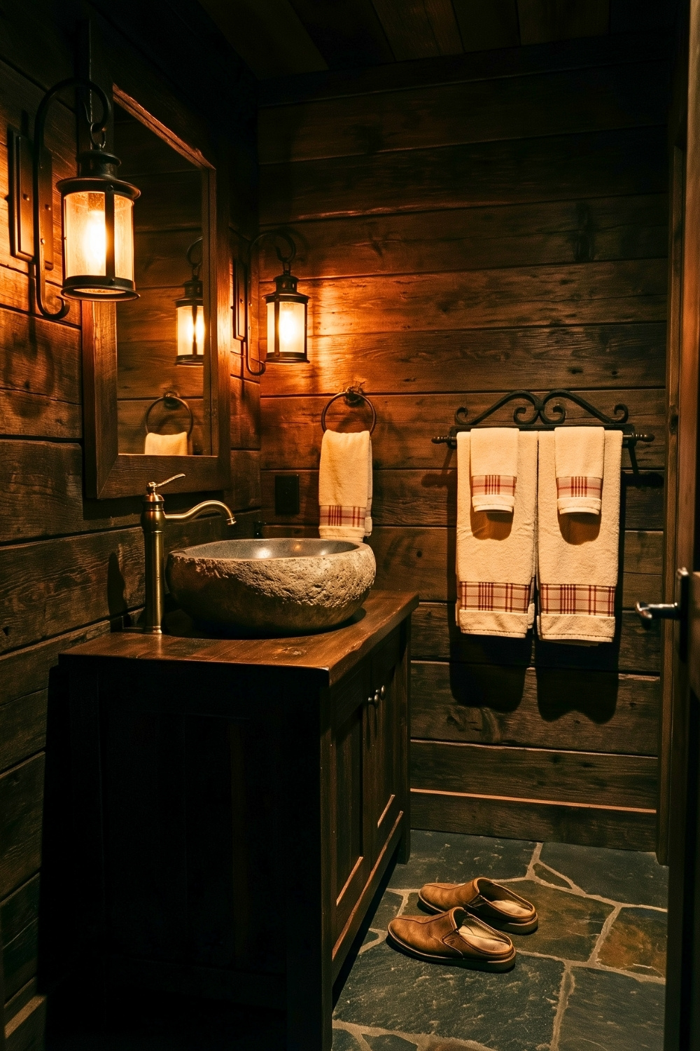 I’ve always had a soft spot for these lantern-style lights and stone vessel sinks because they instantly bring those authentic vintage vibes to a guest bathroom. The way the warm glow plays off the dark wood planks makes the whole room feel like a cozy sanctuary after a long day outdoors. It’s a simple way to master cabin decorating without needing a massive overhaul or expensive remodel.