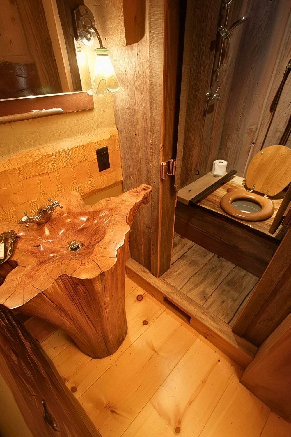 On the wilder side, I am obsessed with u/usernameblank’s bold design – that sculptural stump vanity is the ultimate rustic statement. You don’t even see standard floor tile distracting you here; it is all about that “tiny house meets hunting lodge” character. It would be such a cool look for a guest bathroom that turns everyday routines into a memorable experience.