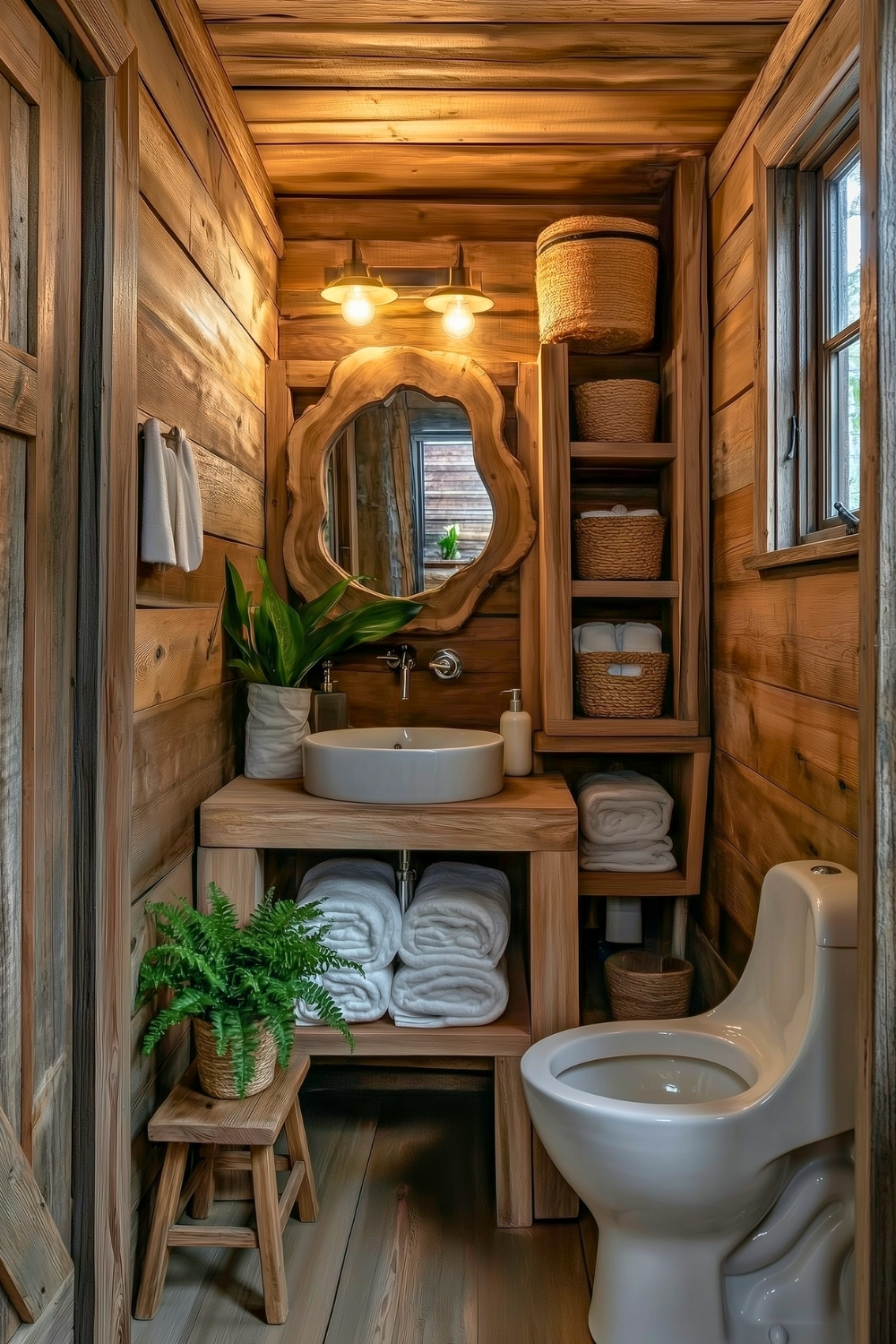 This sense of intentionality is so important when you’re dealing with a narrow cabin layout. I’m a huge fan of using slim vanities and tucked-away storage to keep things functional without the room feeling cramped. It’s proof that a tiny house bathroom can feel incredibly cozy when the design stays simple and the wood tones stay warm.