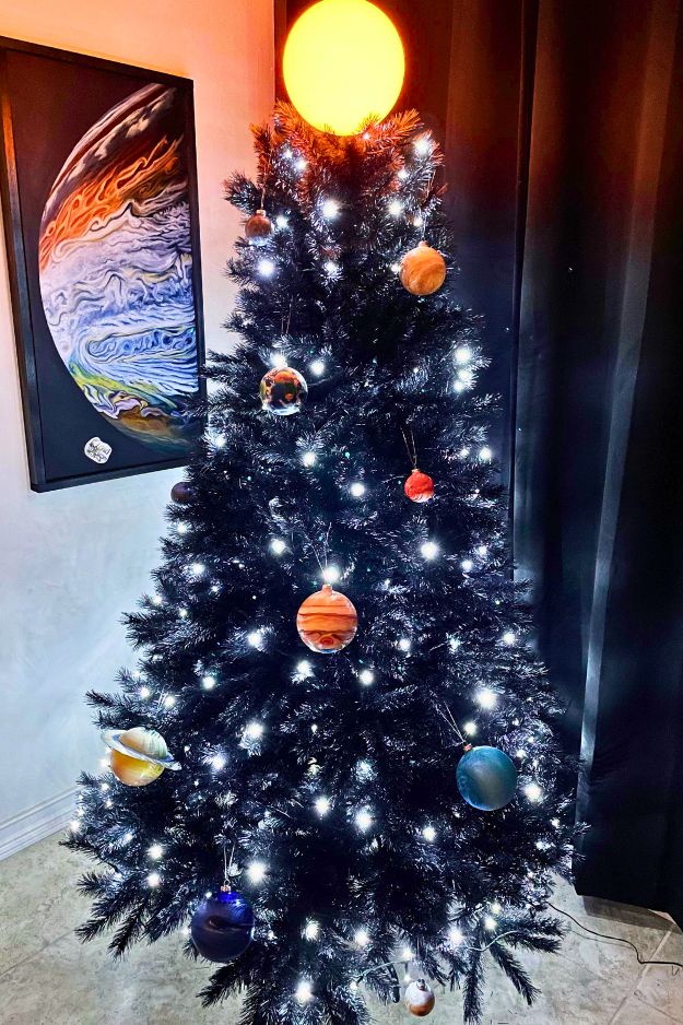 khaosEmerald’s space tree is my kind of nerdy. Hand-painted planets line up in order, Pluto and Ceres included, and that glowing “star” on top is actually a pool light playing the sun. The black tree nails the deep-space vibe, so the colors pop.