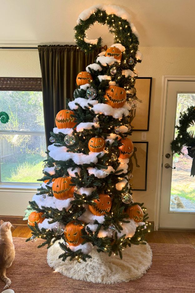 This Nightmare Before Christmas-inspired tree is such a clever bridge between Halloween and the holidays. Flappymeatwad’s friend stacked a regular Christmas tree with a trimmed wreath. Honestly, I love that it doubles as a way to reuse pumpkins from October instead of tossing them out, suddenly Halloween décor feels fresh again for Christmas.
