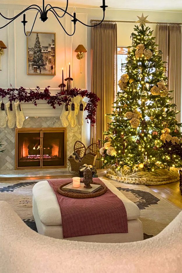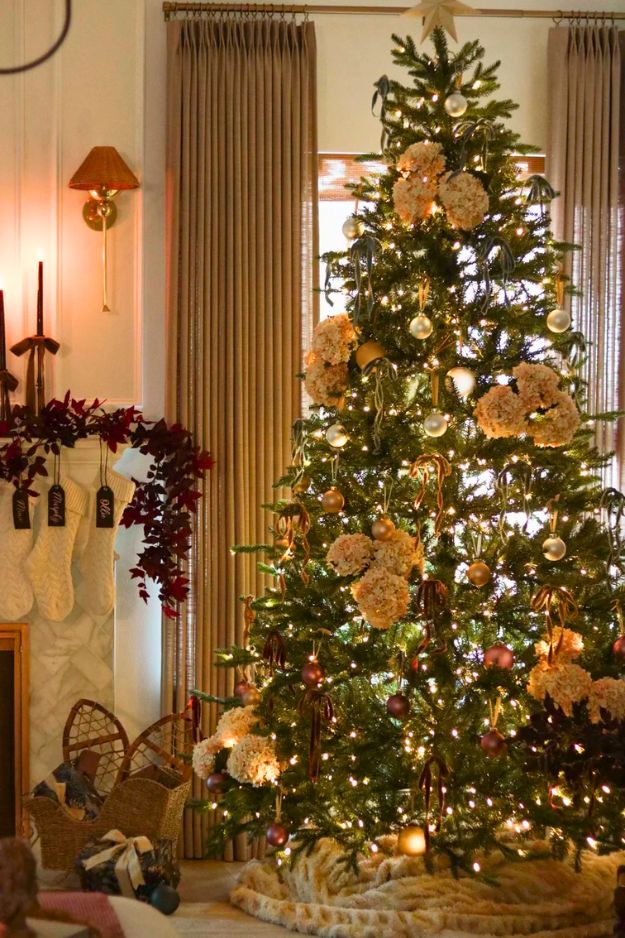 I’ve never seen fresh flowers on a Christmas tree either, and the hydrangeas here feel like such a creative twist. Instead of the usual ornaments, those big blooms soften the look and make the whole setup feel more personal.