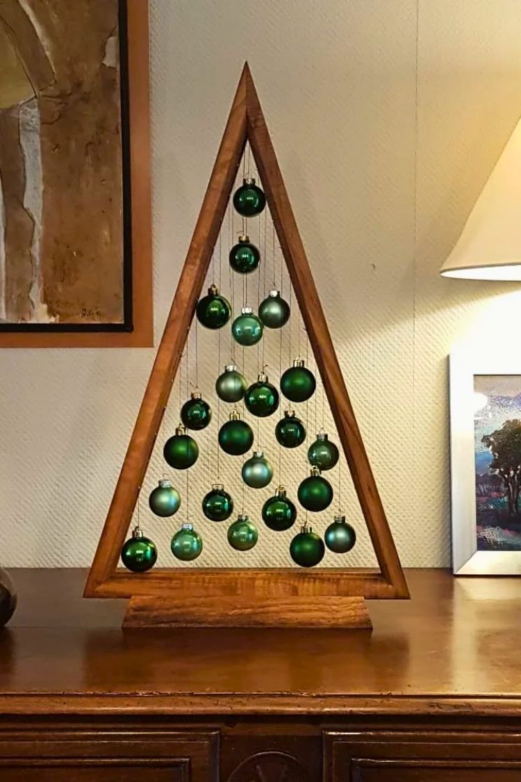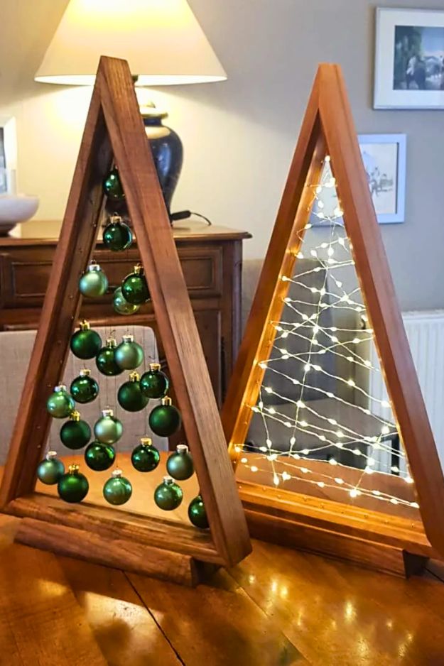 These minimalist wood “trees” give that clean vibes with simple triangles, tiny screw-eye hooks inside for ornaments/lights, and a battery pack routed into the base so no dangling cords.