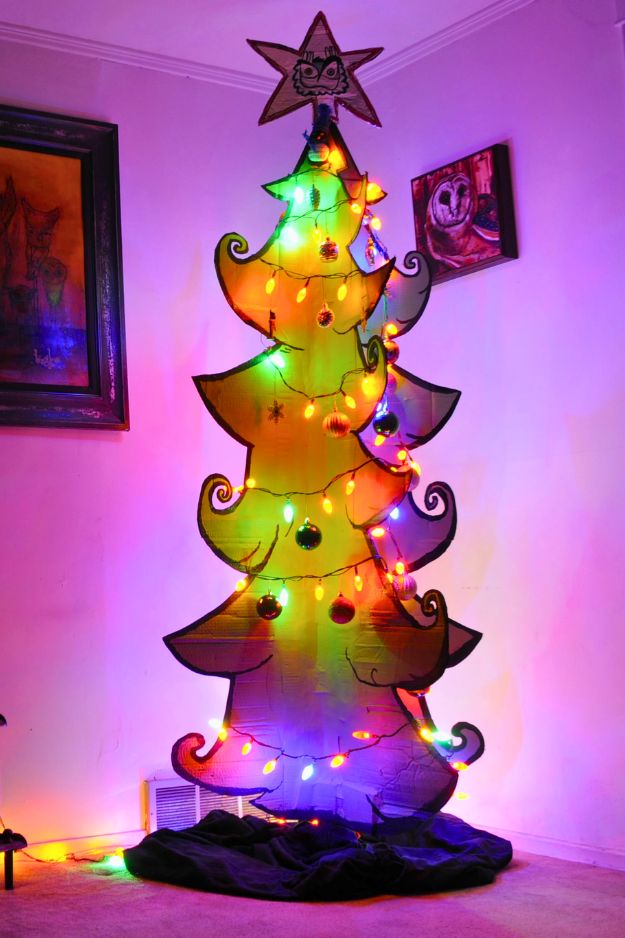 This cartoon Christmas tree looks like it jumped straight out of a Dr. Seuss book or the game Don’t Starve. The “branches” are just cardboard strips hot-glued, curled, and covered in paper-mâché around a metal pole, then hand-painted to nail that flat, illustrated look. What I love is how practical it is, it spins on the pole so stringing lights is easy, it stores flat, and apparently even the cats ignored it. By snarkinfestedwaters