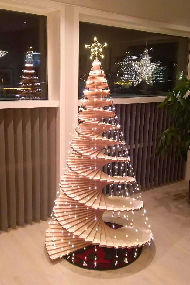 I was blown away by this spiral Christmas tree made entirely of lights, such a simple idea but so striking. The boards are stacked one by one into a continuous staircase that winds upward, and the glow traces the perfect tree shape without a single branch. It feels modern and sculptural, almost like something you’d expect in a gallery window.