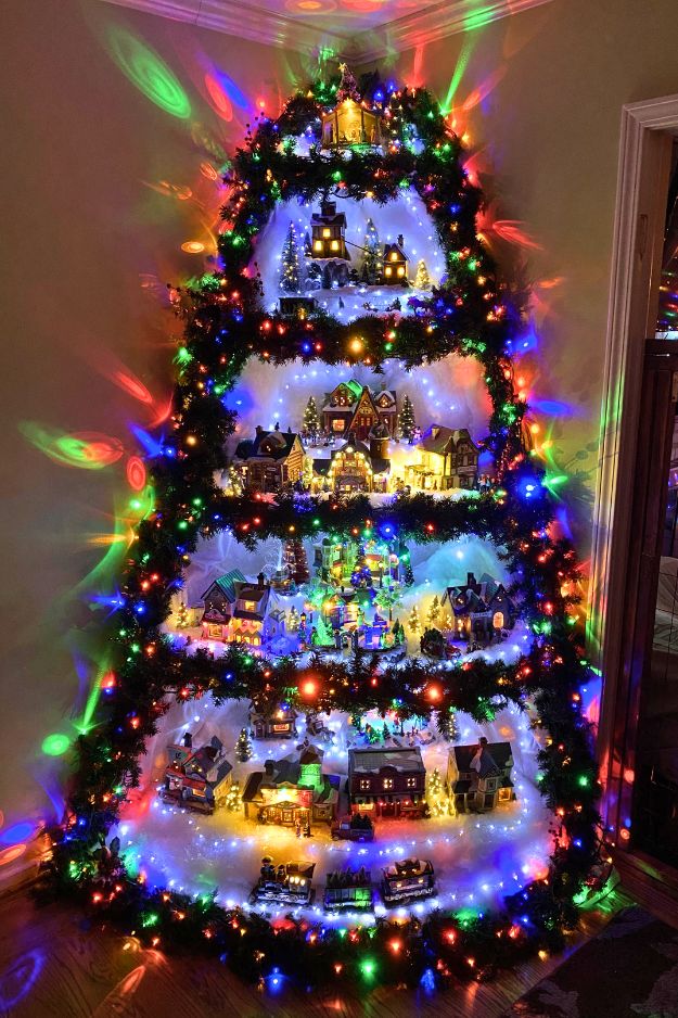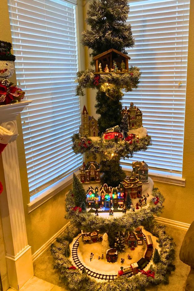 This Christmas village tree honestly stopped me for a second, it’s not just decorated, it feels like a little world stacked straight into the branches. The creator built it out of plywood. Platforms were added so the back houses could sit level, and all the wiring was cleverly hidden. Layers of blanket snow mixed with fluffier pieces gave it that frosted look, and it stuck to the wood without glue. The idea originally came from Pinterest, but it took plenty of trial and error to pull off