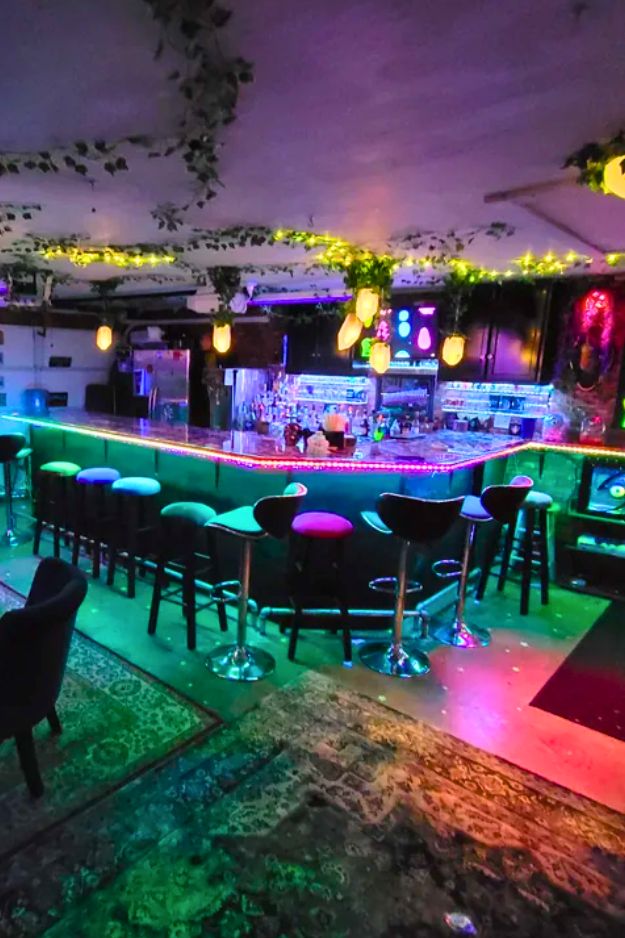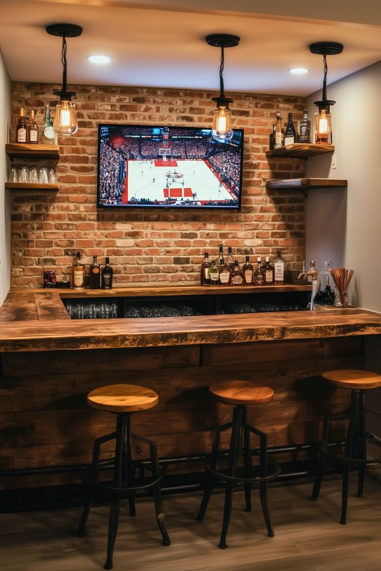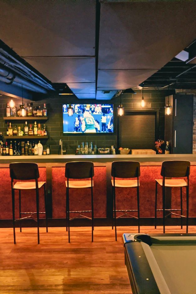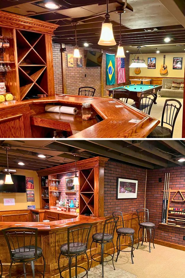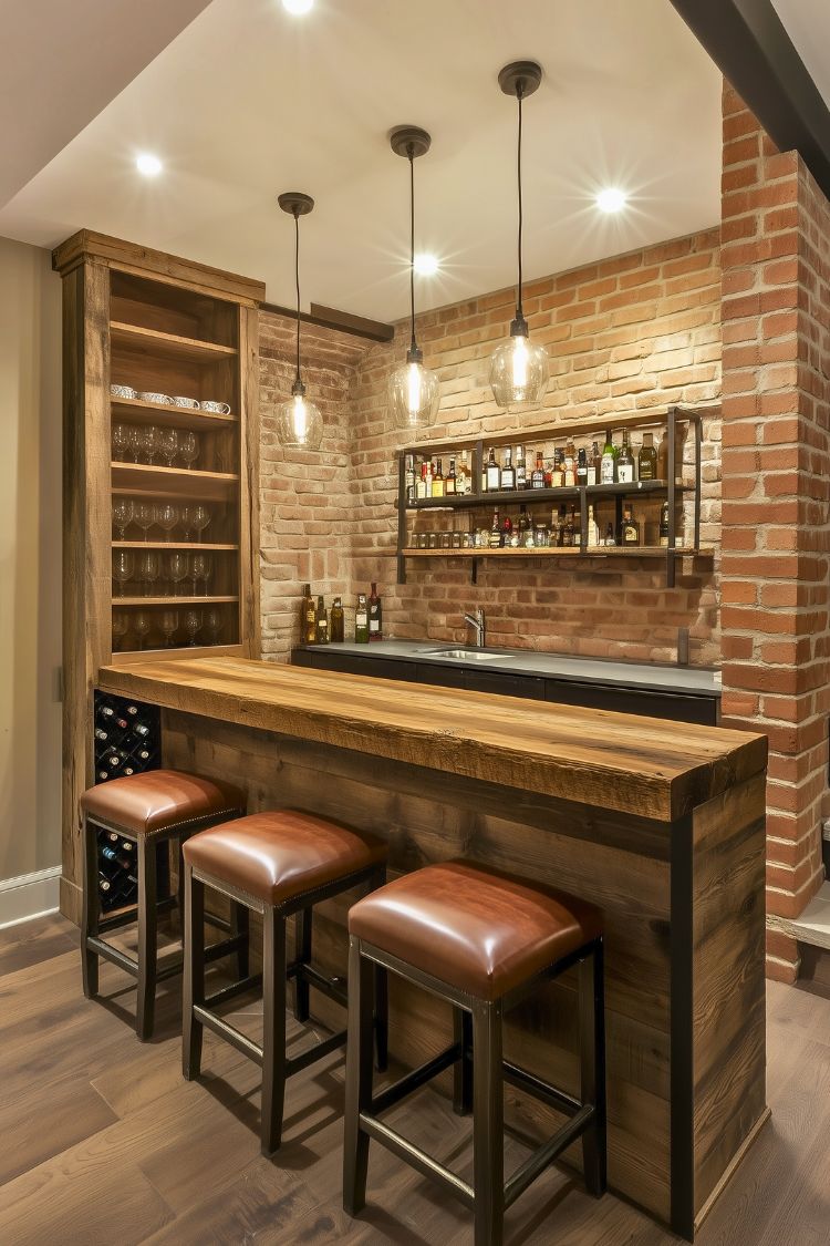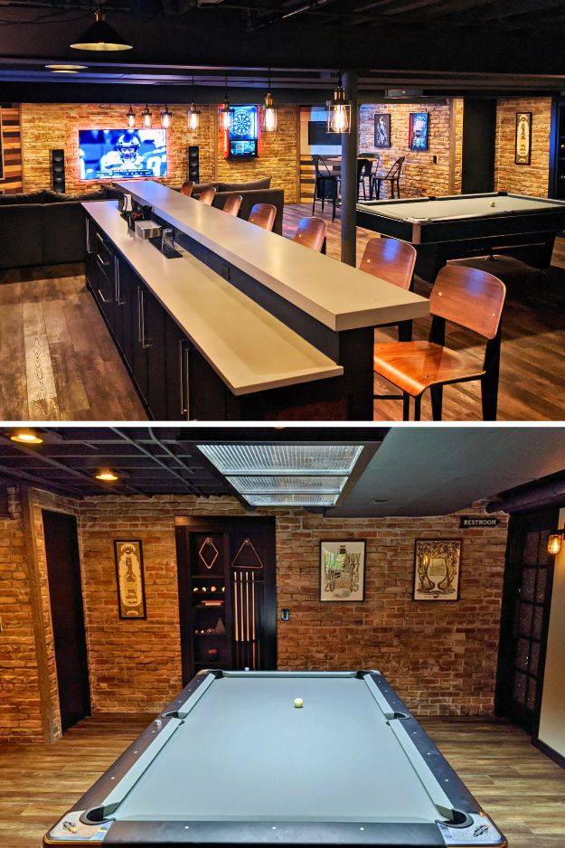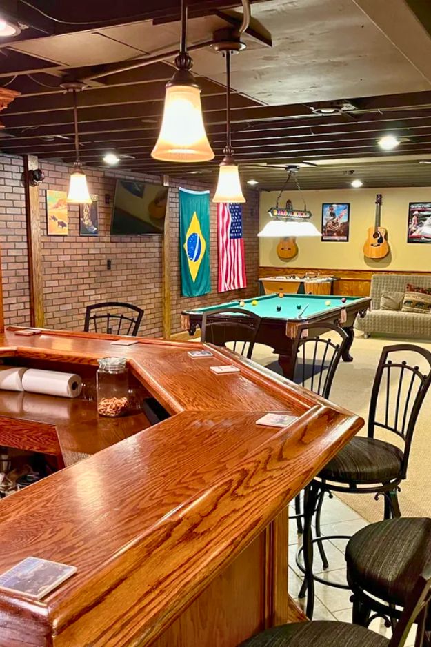 The brick walls and black trim give it that classic, moody vibe, and the big bar setup makes you forget it’s even in a house.