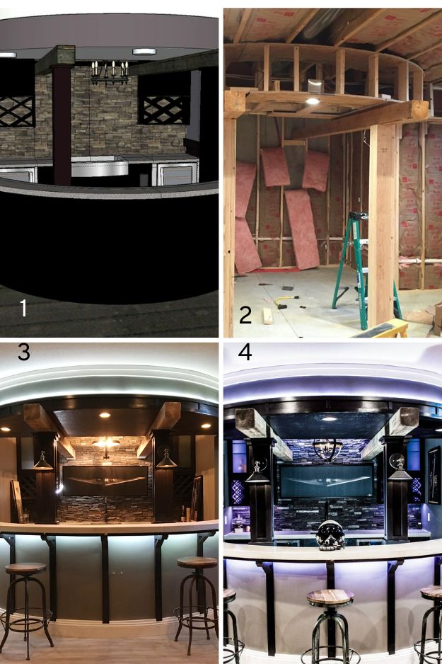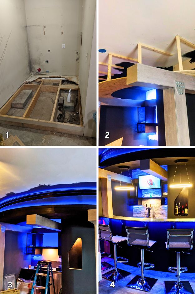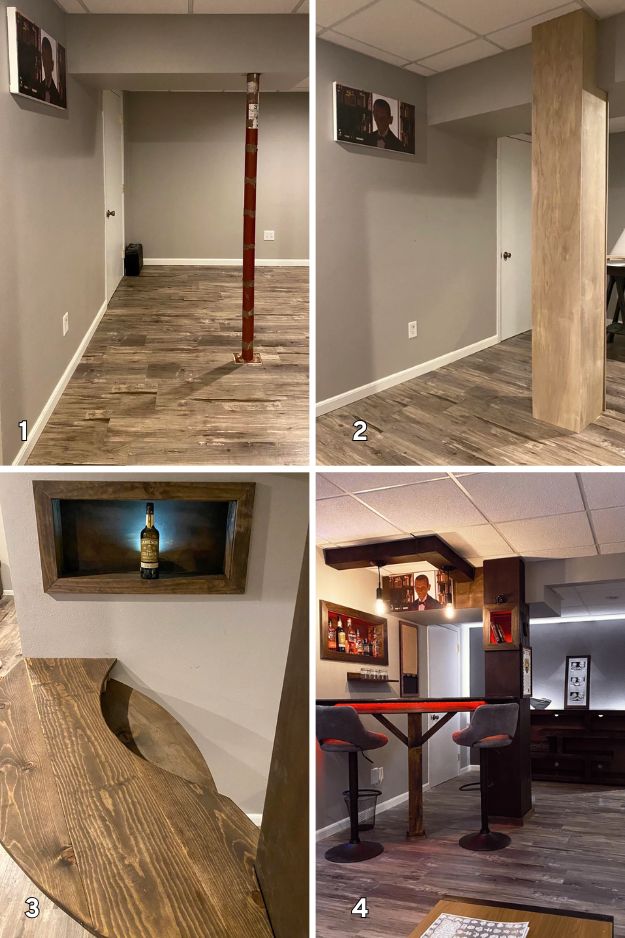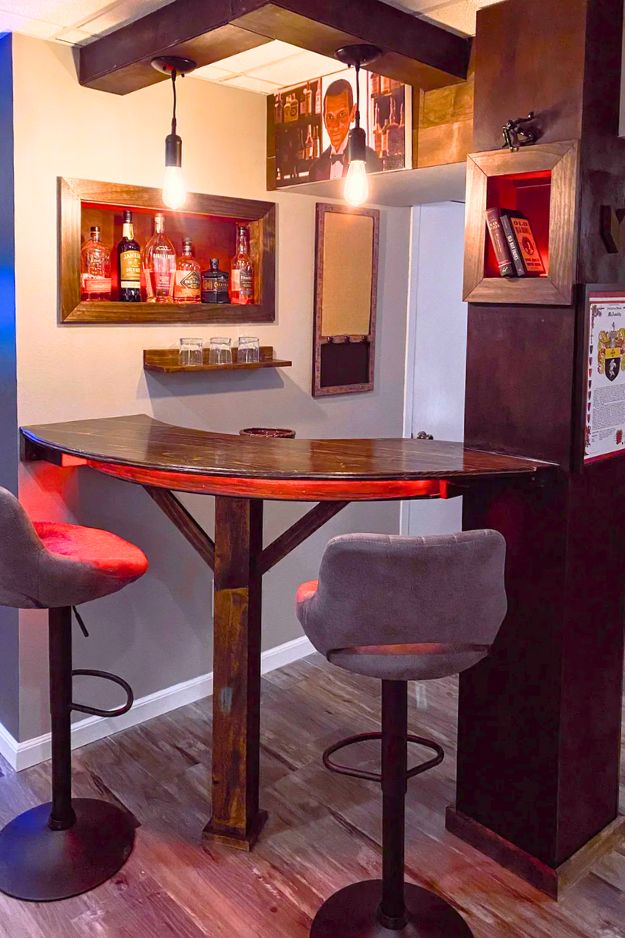 Sometimes happy accidents turn out way cooler than planned. What started as a simple idea to hide an awkward support pole somehow evolved into a full-blown curved bar, complete with recessed shelves and moody lighting.