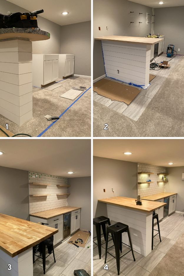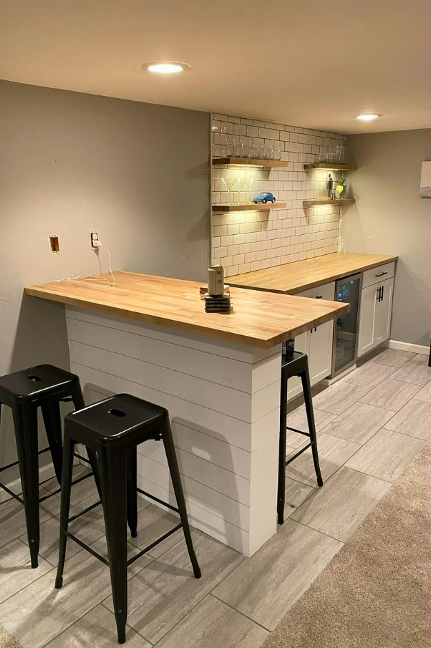 He built the whole thing for around $1,600, and it still looks polished with that butcher-block counter, subway tile, and those glowing floating shelves. It’s technically a dry bar, but he planned ahead so a sink could be added later, which is just smart.