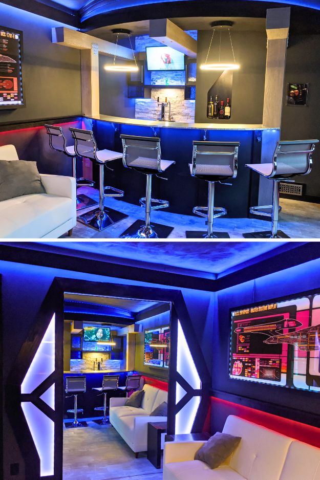Every time I look at BobJones97’s bar, I can practically hear that “whoosh” sound when the door slides open. He turned what used to be a junk room into a full-on Star Trek–inspired home bar, building everything from scratch with his wife over eight months.