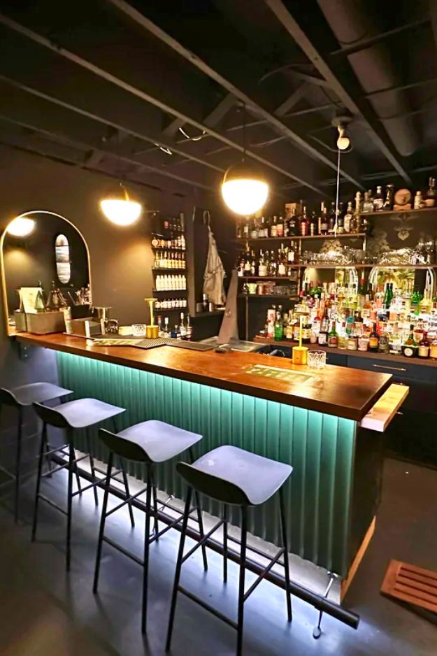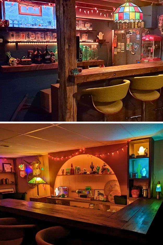 Cocktailculture spent a year transforming an old canning room into a cozy, speakeasy-style hideaway, with secret door, booth, and all. He sprayed the ceiling with “dry fall” paint, rebuilt a shattered LED shelf by hand, and turned a tall mirror into a hidden access door for his water meter. Even with just 12.5×10.5 feet to work with, he planned every inch perfectly. The best part is he even designed his own menus and coasters!