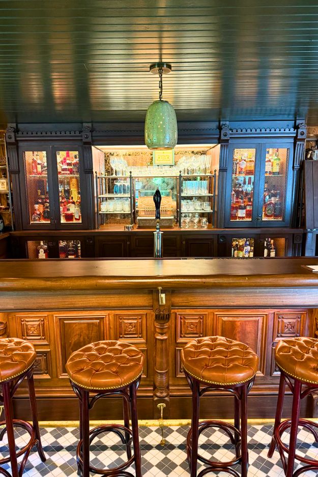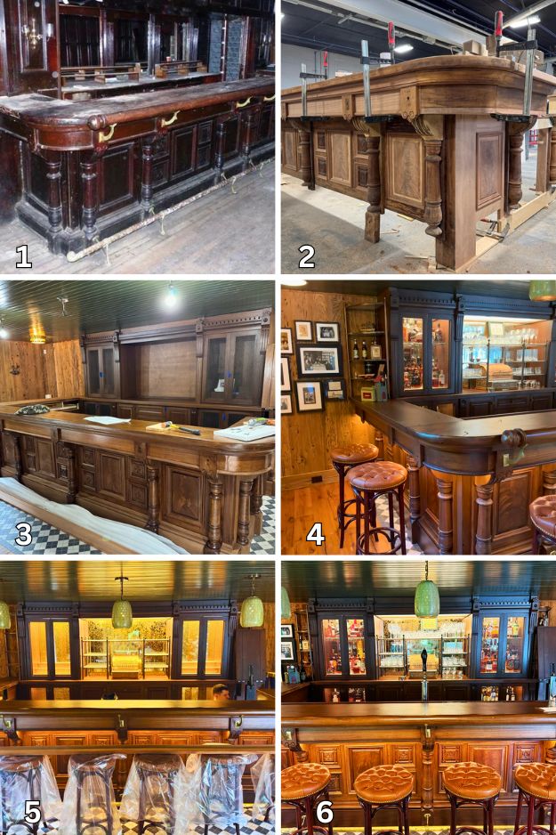 New trim, carvings, and turned pieces were built by hand to blend seamlessly with the originals, each one distressed to match the bar’s century-old patina. After staining and sealing, he finished it with a toned clear coat that gives the wood that deep, timeworn glow.