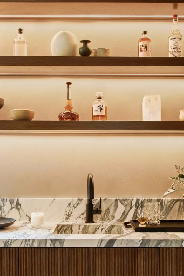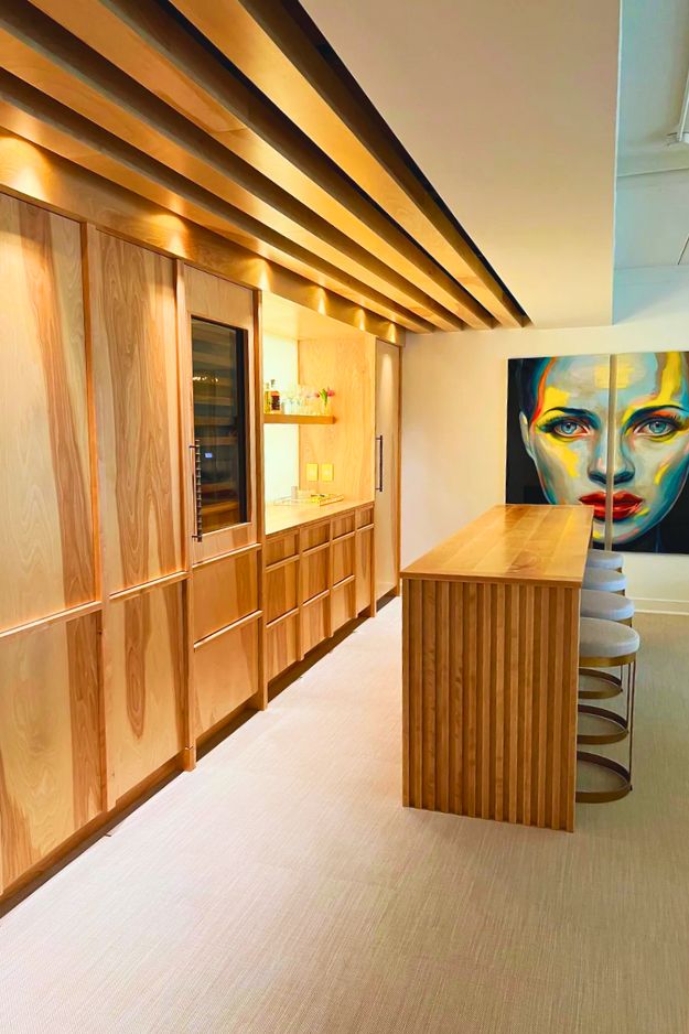 This remodel is honestly stunning, that blend of Japanese and modern design just works so well here. The natural yellow birch gives the space this calm, golden warmth, and the slatted bar front paired with those clean drawer pulls makes everything feel super intentional.