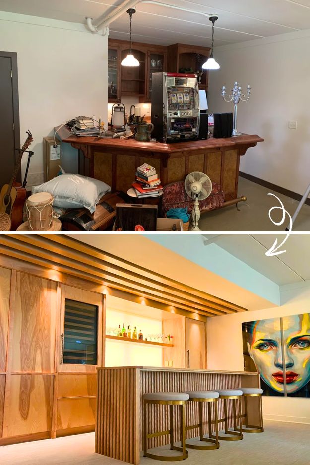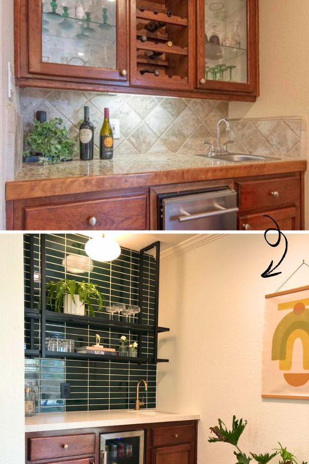 They stripped away the bulky cabinets and awkward wine rack, opened up the space, and brought in quartzite counters plus those custom metal-and-glass shelves they designed themselves. Honestly, it looks more current and high-end than the original photo ever did.