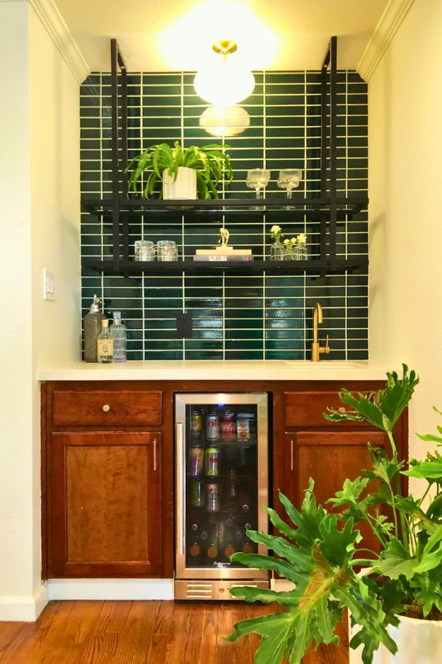 Look how this wet bar turned out, that dark green backsplash against the metal shelving just hits perfectly. It gives the whole setup a sleek, modern edge without losing the charm of the 1960s bones.