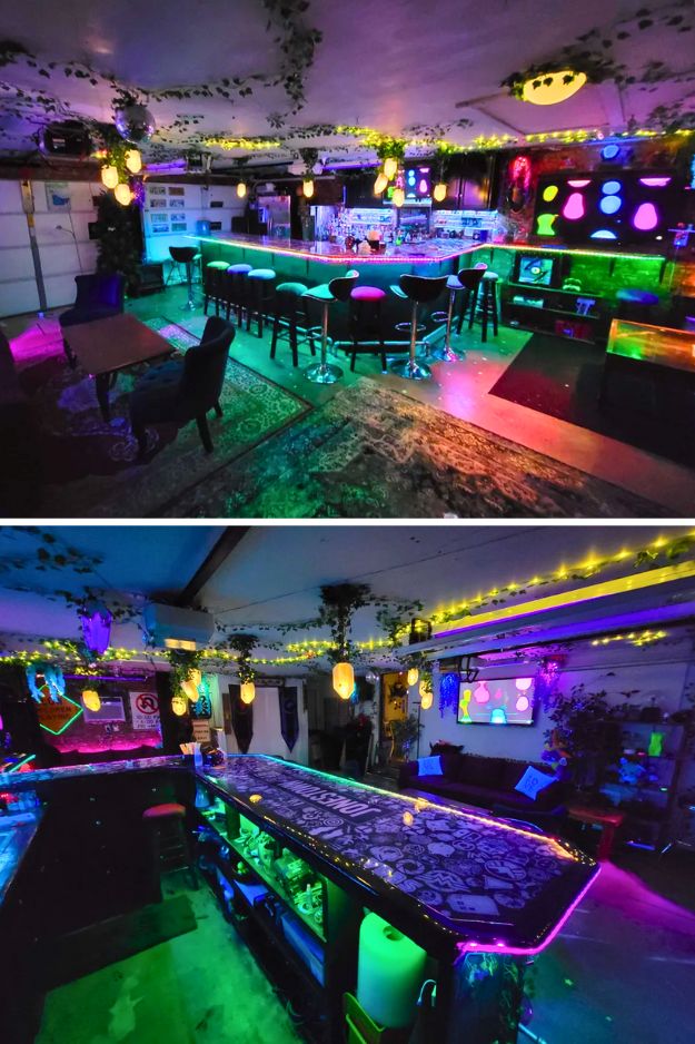 This guy basically turned his garage into a full-blown bar, and I’m not exaggerating. It’s got a 1000-watt sound system, three TVs, a frozen drink machine, and a setup that looks like it could charge the cover at the door.