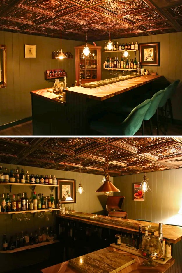 This home bar looks like the kind of place you’d stumble into after midnight and never want to leave. What’s wild is how he pulled this off with just an 8-foot ceiling, low enough to feel intimate, but not claustrophobic. The secret is ABS ceiling tiles. It mimics real tin but is way easier to install. He just swapped them into a drop ceiling grid and boom, instant speakeasy vibes.