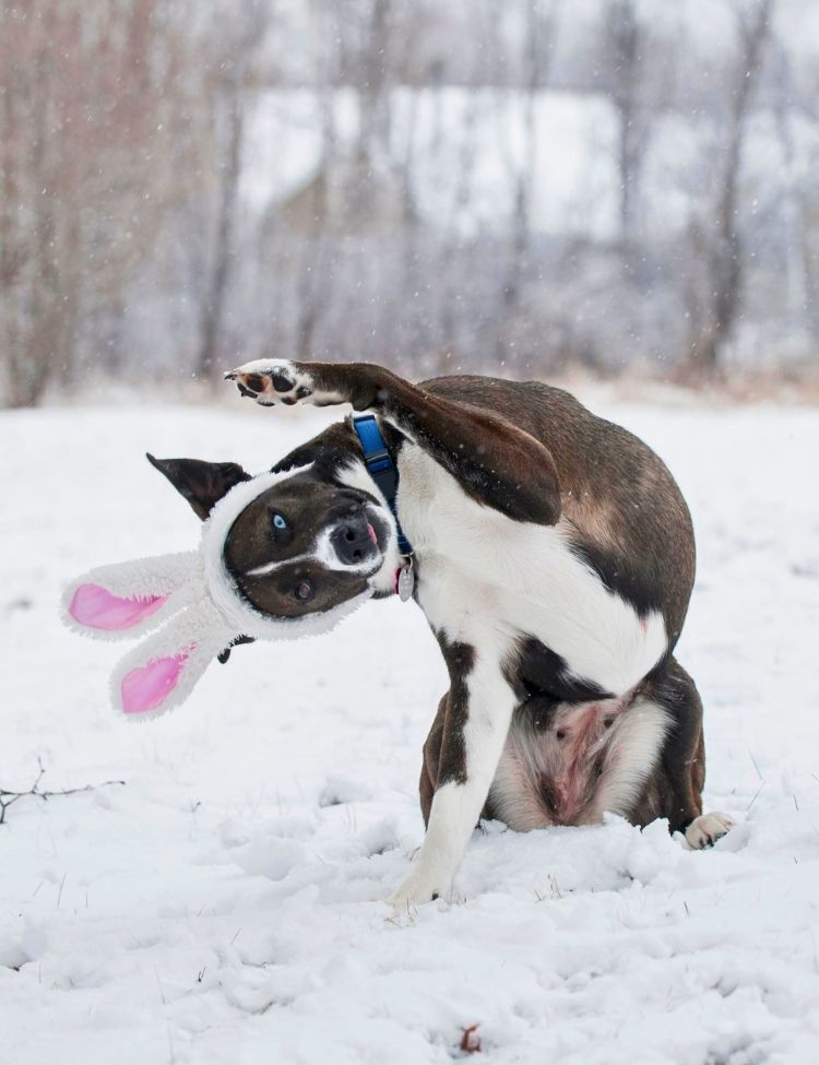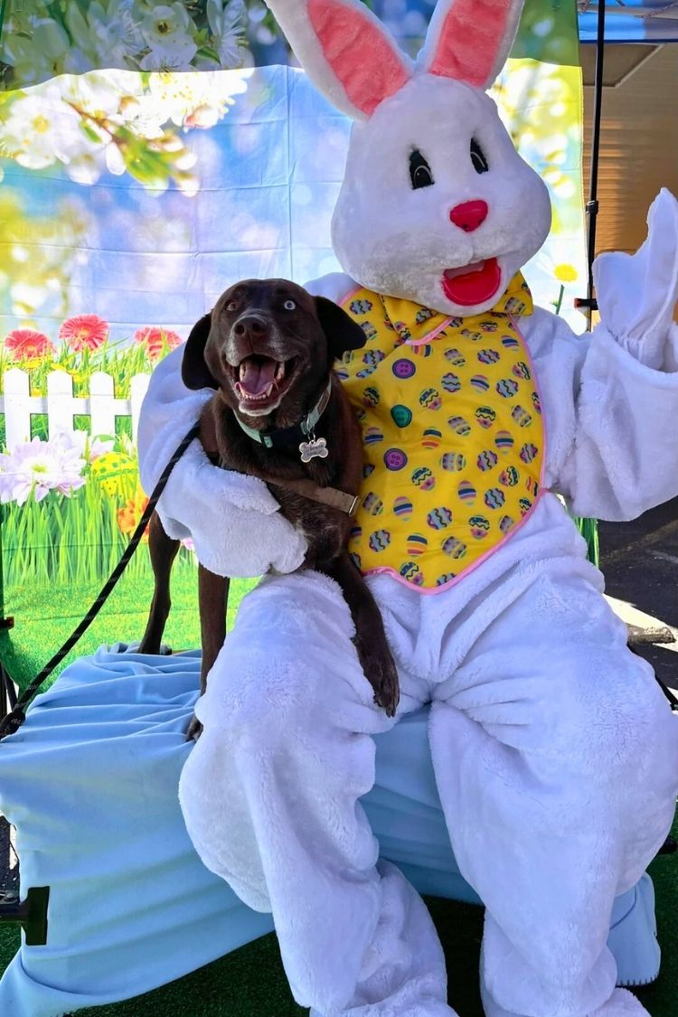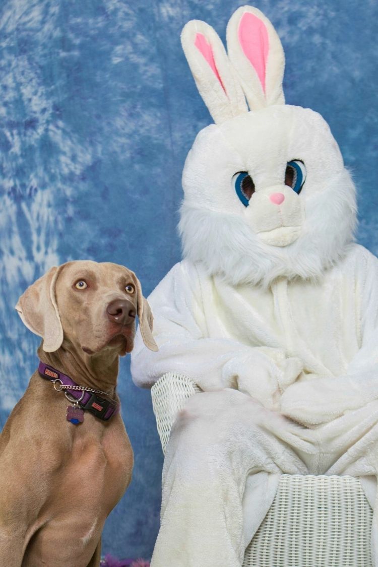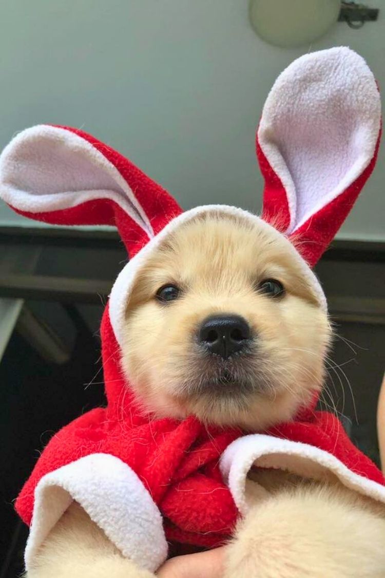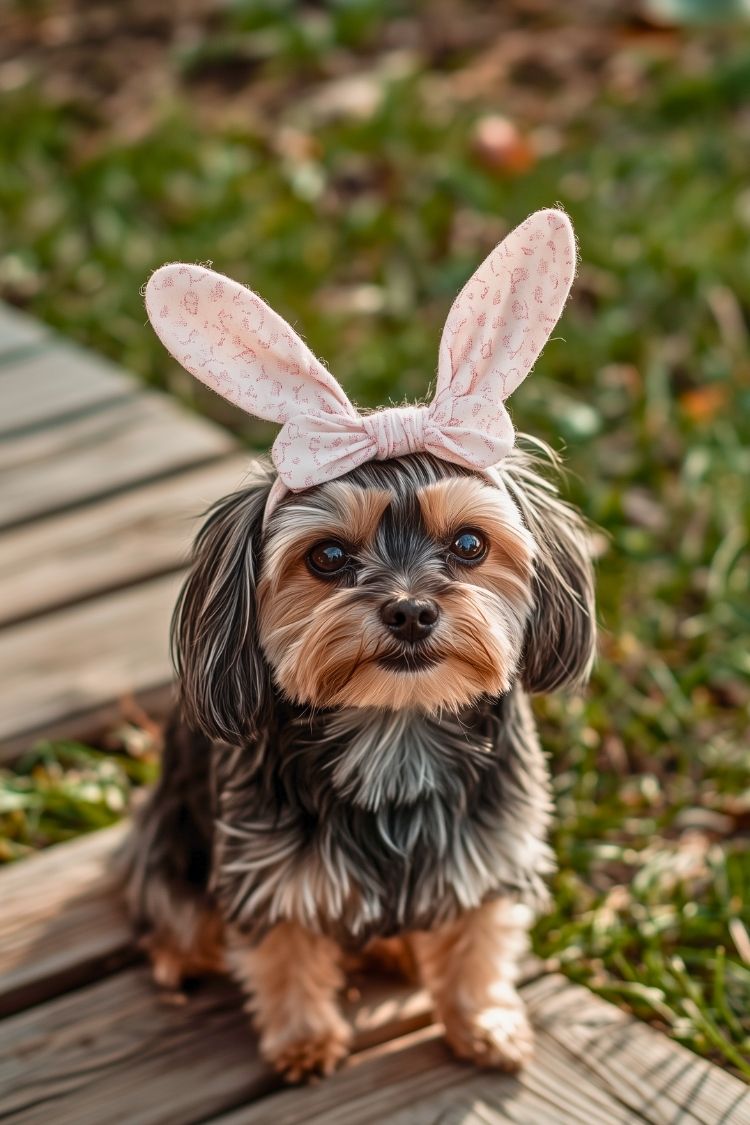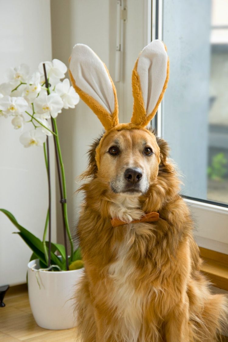 This one, too. The charm here isn’t in fancy props but in how naturally the dog fits into the moment, like he wandered in, heard someone say “cute bunny,” and decided to roll with it.