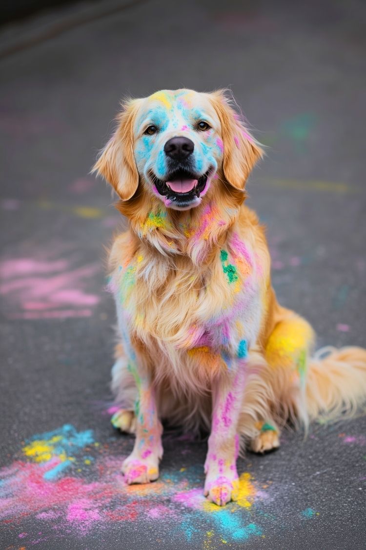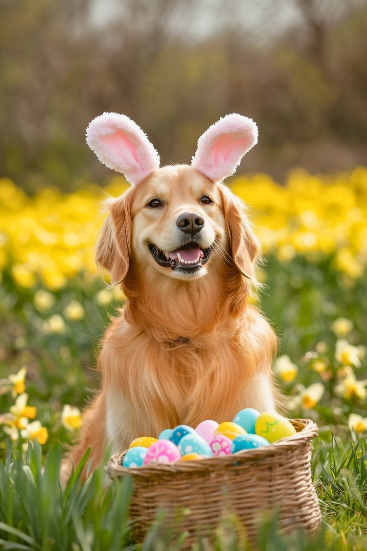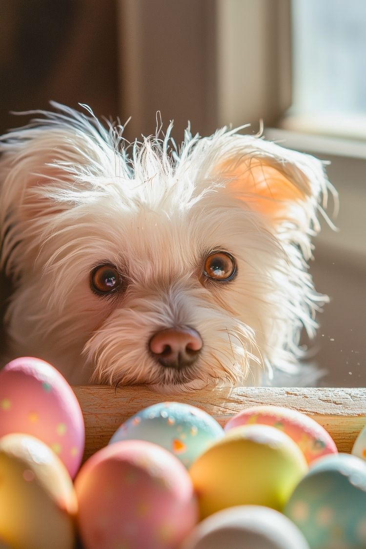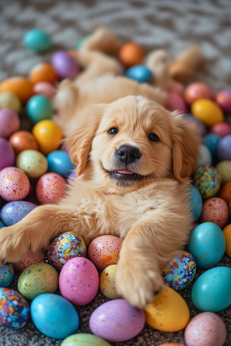 I swear the energy of Golden Retrievers fits best with the Easter Holiday. Just look at his face, the picture is playful and slightly chaotic in the best way. The eggs fill the entire frame because it gives the shot a fun, immersive feel. It looks joyful, messy, and very adorable.