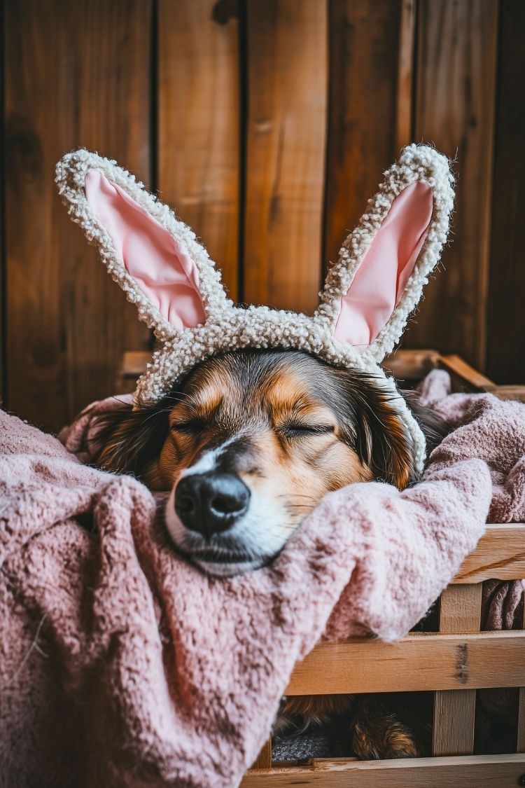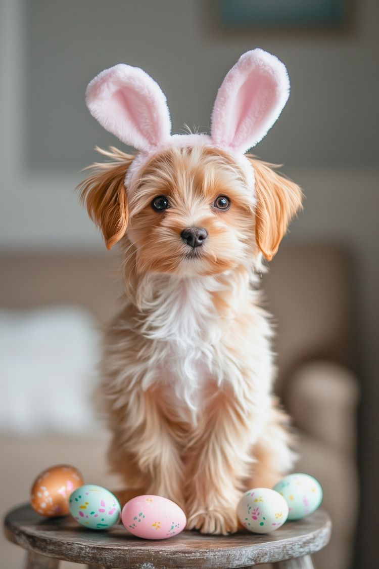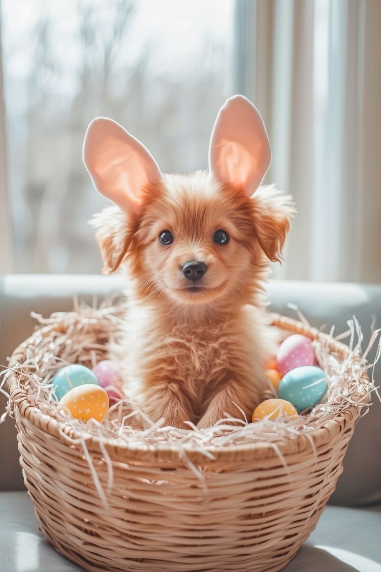 This little bunny-eared pup sitting in a woven basket honestly stopped me for a second. Those oversized ears and soft, fluffy chest make it look like a real-life Easter plush, but better. It’s easy to do, sweet, and perfect when you want a photo that feels magical without trying too hard.