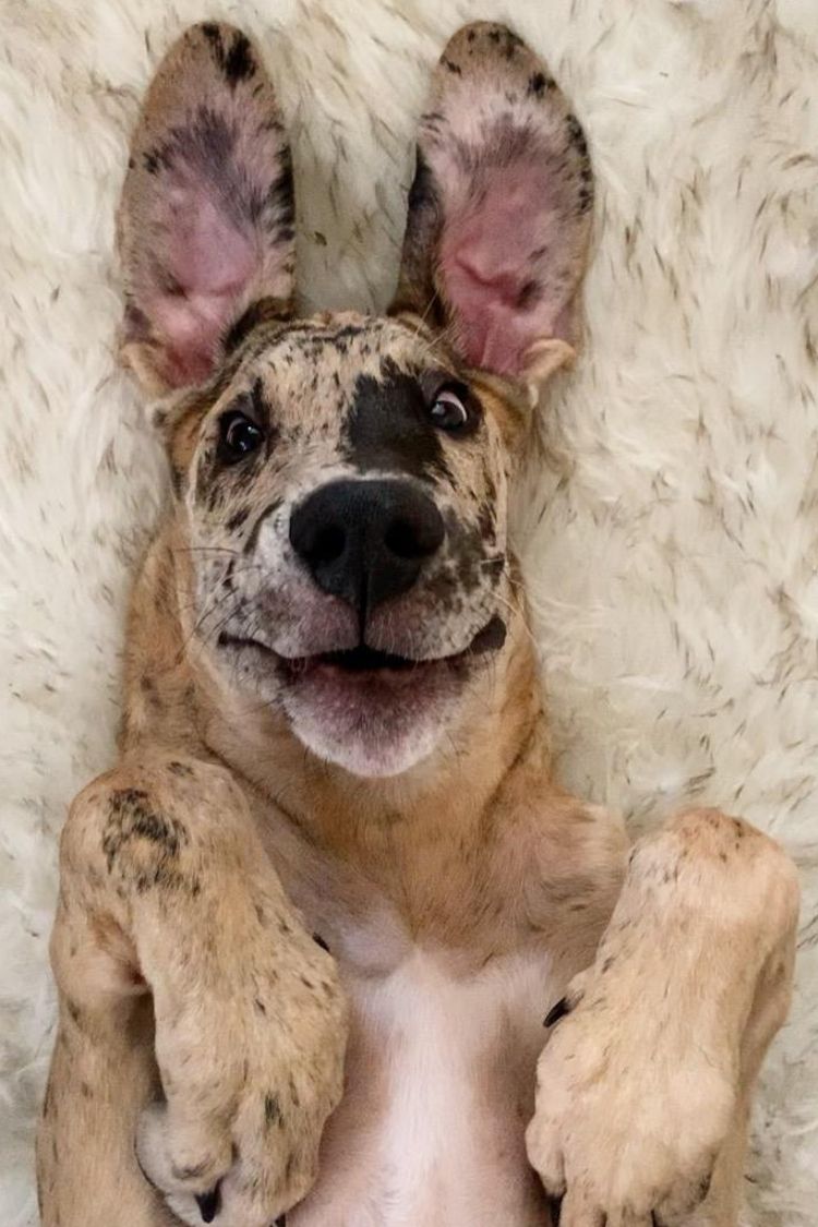 This one by a random user on Reddit also cracked me up in the best way. That bright, open-mouthed smile says he genuinely enjoys the attention. He proudly wears floppy pink bunny ears like it’s his true calling, and the contrast makes the whole photo even better.