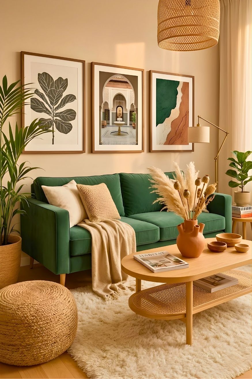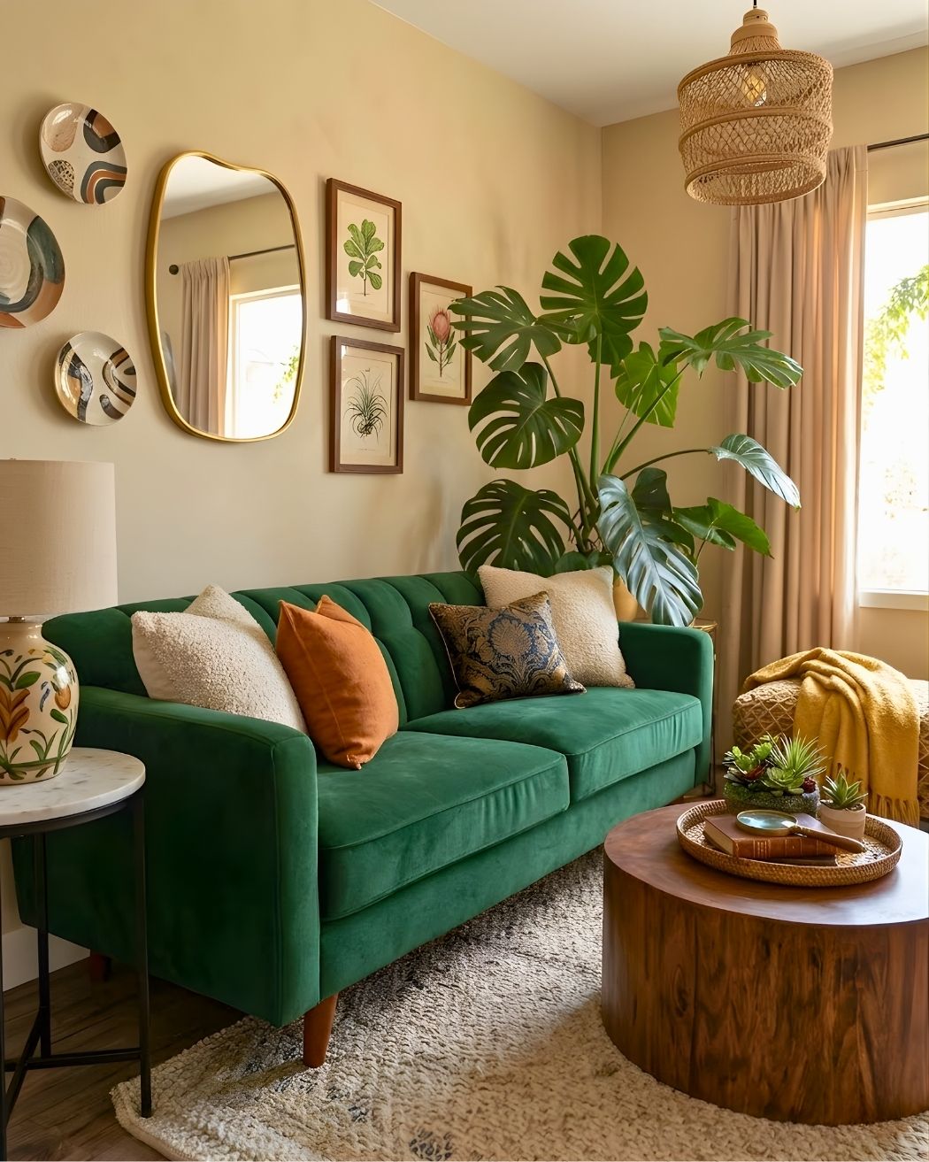 This earthy tone gets me at first sight, ngl. There’s something so grounding about balancing a bold emerald velvet sofa with warm wood tones and neutrals. It’s the perfect way to make a statement piece feel lived-in and cozy rather than just “for show.”