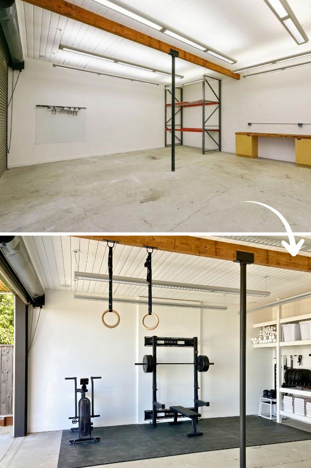 The epoxy floor and recessed lighting make it feel more like an actual living space than a garage, and honestly, it looks like a commercial gym you’d need a membership for.