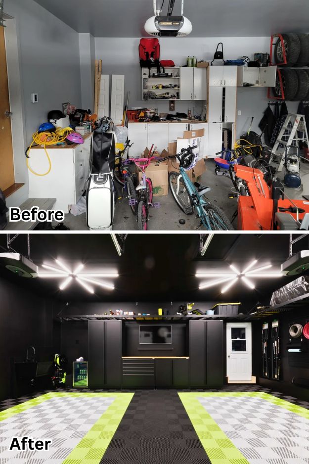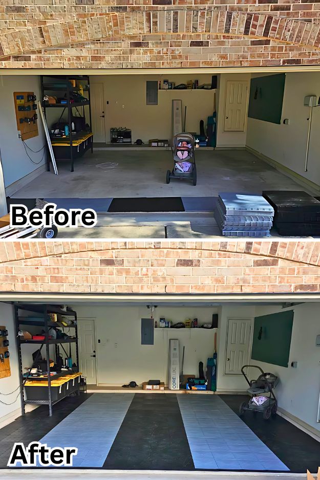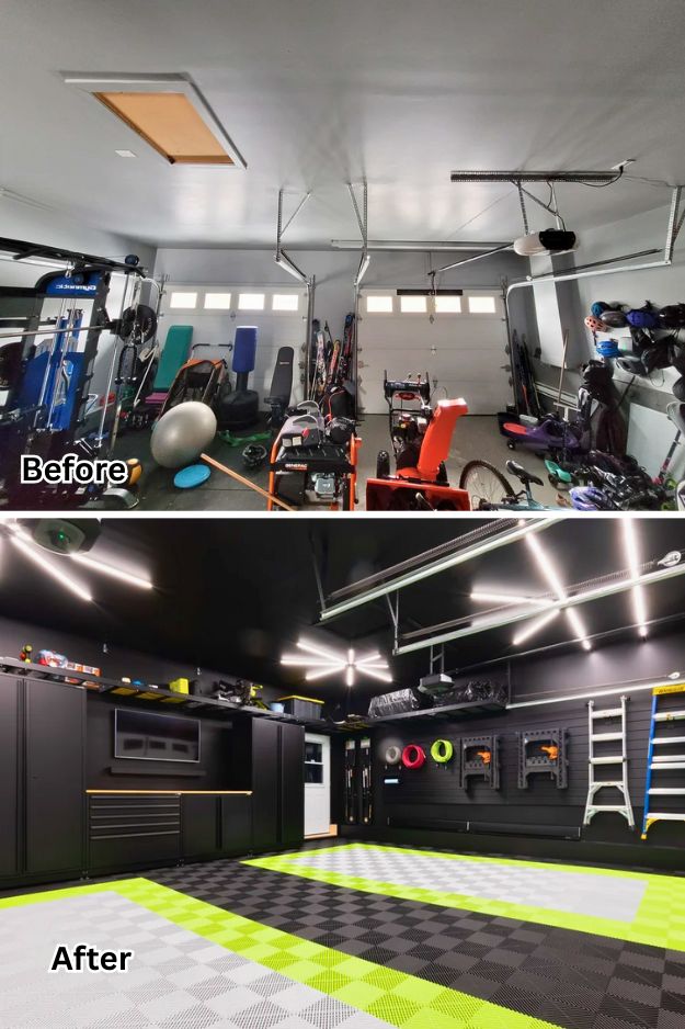 This garage makeover is the kind of transformation that has every guy secretly jealous, it’s basically the blueprint for a dream setup. In just two months he turned plain concrete into a sleek grid of Swisstrax tiles in black, silver, and green, added a utility sink that somehow looks luxurious, and finished it off with storage that actually matches.