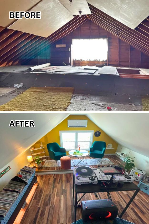 This was built to secretly get away from the kids. Stereocrew’s garage loft makeover nails the idea of a secret hideout. They turned what was once a dirty attic space into a colorful retreat with velvet chairs by the window, a blue fridge, and that sunshine-yellow Benjamin Moore wall tying it all together.