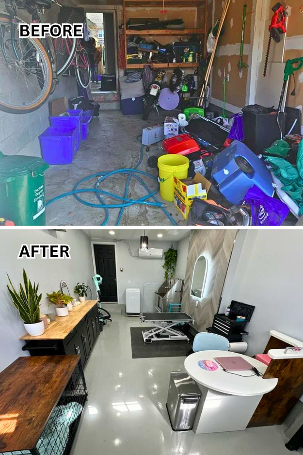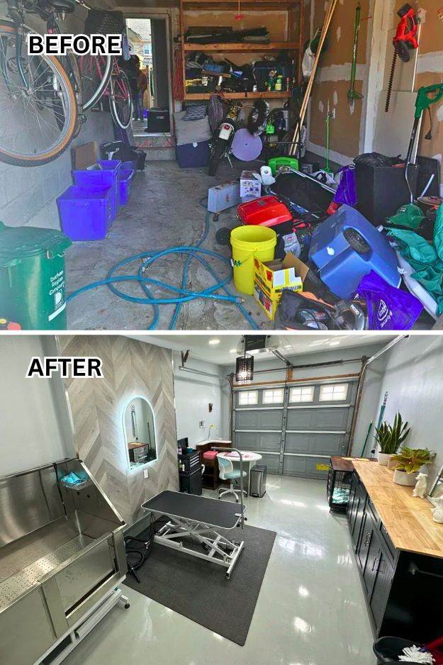 ElderGiff didn’t just fix up a garage, he decided to run a full-on business out of it, and it works. The space looks like a legit grooming salon, with epoxy-coated heated floors, vinyl walls, and a lift tub that makes washing dogs way easier.