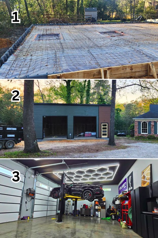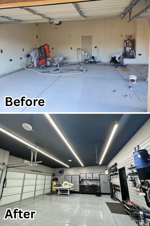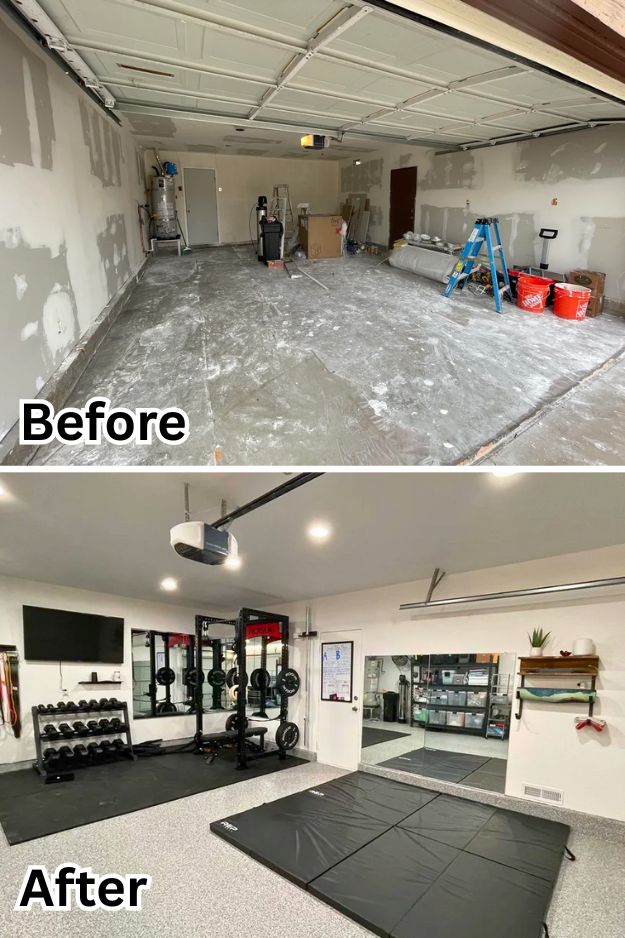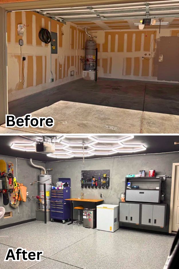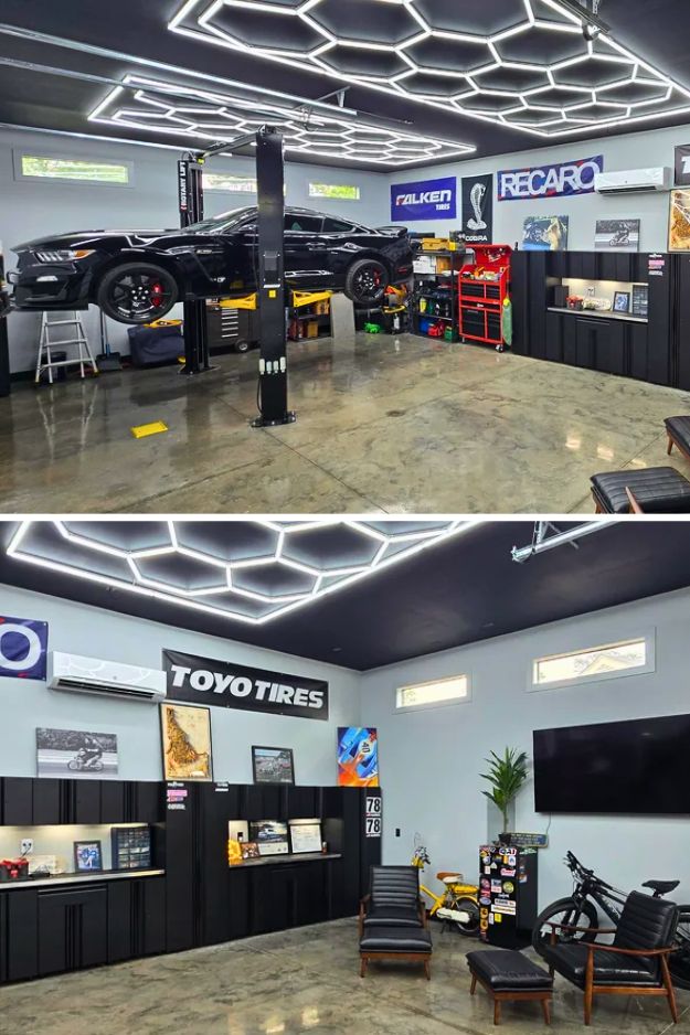Calling this a “simple” before-and-after feels like underselling it, Dontchawishyo’s garage looks completely new. The hexagon lights are the first thing that grab you, and paired with the shiny flaked epoxy floor, the whole space just feels sharp. He tried out that Venetian plaster paint from Lowe’s, and even if it wasn’t perfect, it definitely beats raw drywall.