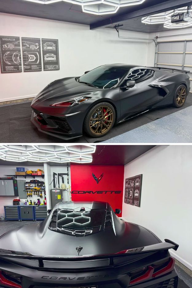 The lighting is crisp, the floor is spotless, and rolling a Corvette into the finished space makes the whole thing feel next level.