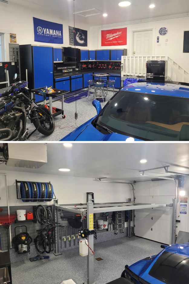 The real flex is the Lift King 4-post lift that lets him tuck his Corvette above his wife’s SUV in winter while still leaving room for bikes and a truck.