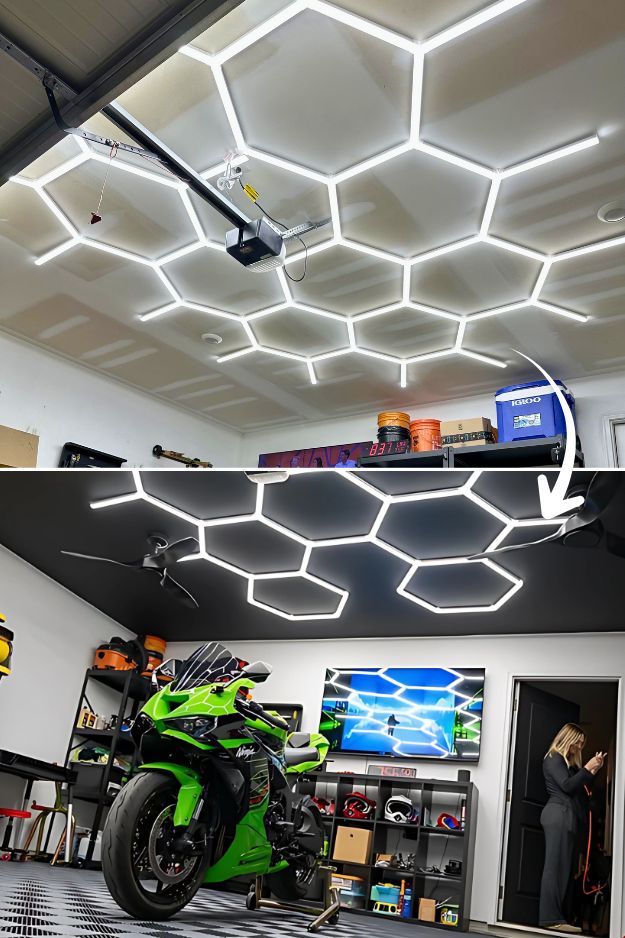 MobiusTech’s garage is one of those setups that makes you laugh a little because it’s so close to perfect, but that bare ceiling keeps stealing the spotlight. The hex lights look great, but hanging them against unpainted drywall is kind of like putting a tuxedo on without shoes, you can’t unsee it. Glad he decided to paint it black in the end.