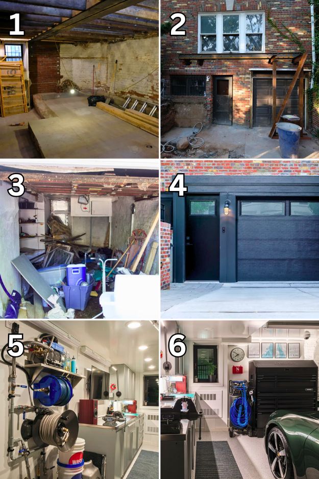 This 100-year-old NYC garage went from unusable to jaw-dropping after some serious work, widened walls with new steel, fresh slab and drainage, epoxy floors, and a custom wall-mounted pressure washer setup he color-matched to his cabinets.