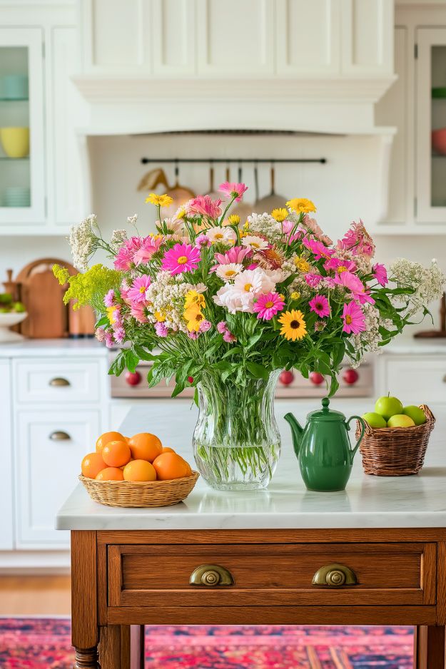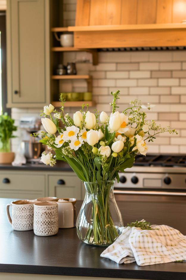 But this next kitchen totally changed my mind. It still feels intentional, not messy, but way more fun than sticking to just one flower. Honestly, it’s a good reminder that decor doesn’t have to be perfect, sometimes the prettiest spaces happen when you just mix things up a little.