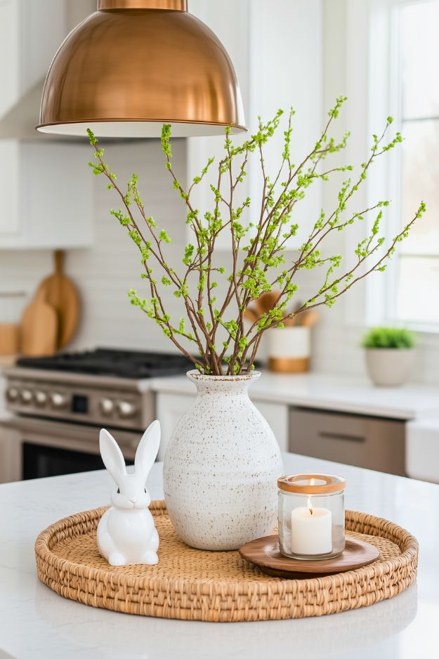 What I like about this setup is how it captures spring and Easter vibes without going pastel-crazy. The earthy textures, simple branches, and that little bunny decor are just enough to feel festive but still minimal.