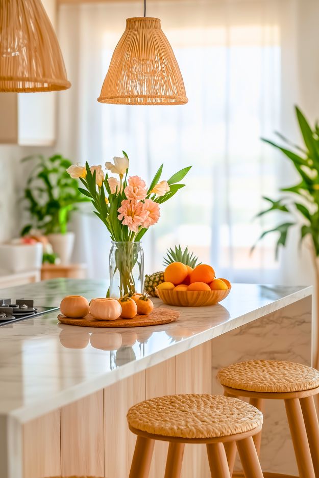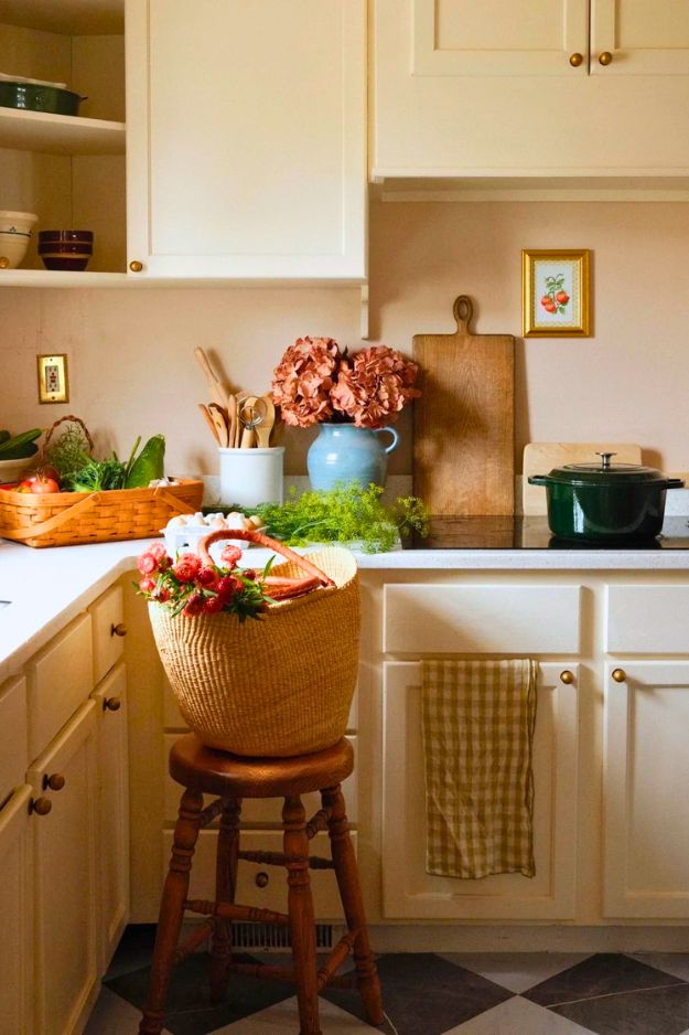 This kitchen’s vibe is like, “yeah, it’s spring” not “OMG SPRING!!!” The pink blooms and fresh basil are enough to give it life without making it feel themed. It’s calm, intentional, and quietly seasonal.