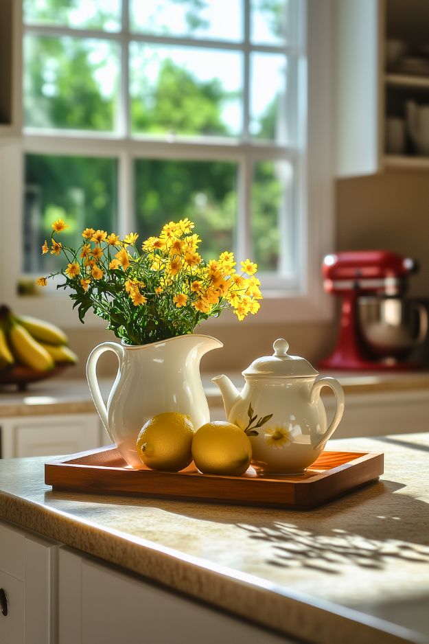 I actually like the idea of decorating with things you already have at home, like a simple pitcher, a tray, and a few fresh lemons. It feels effortless, but somehow those little everyday items can make a space look instantly brighter and more inviting.