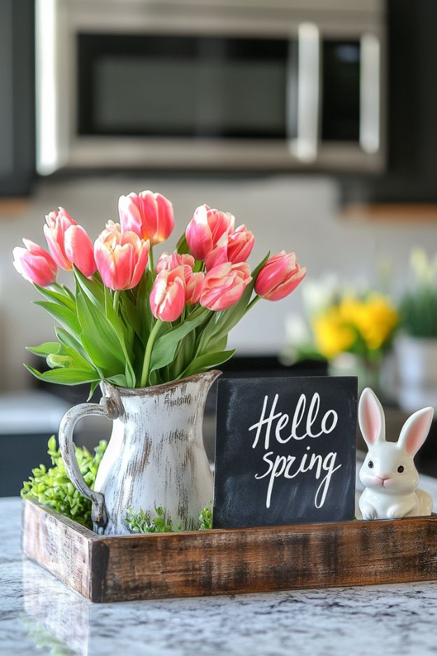 The decor looks like something someone who genuinely loves spring would put together, not a last-minute Target haul of pastel overload. The rustic tray, pink tulips, and that tiny bunny, so cheerful and festive. Like something you’d actually keep out all season because it just feels right, not because it’s Easter.