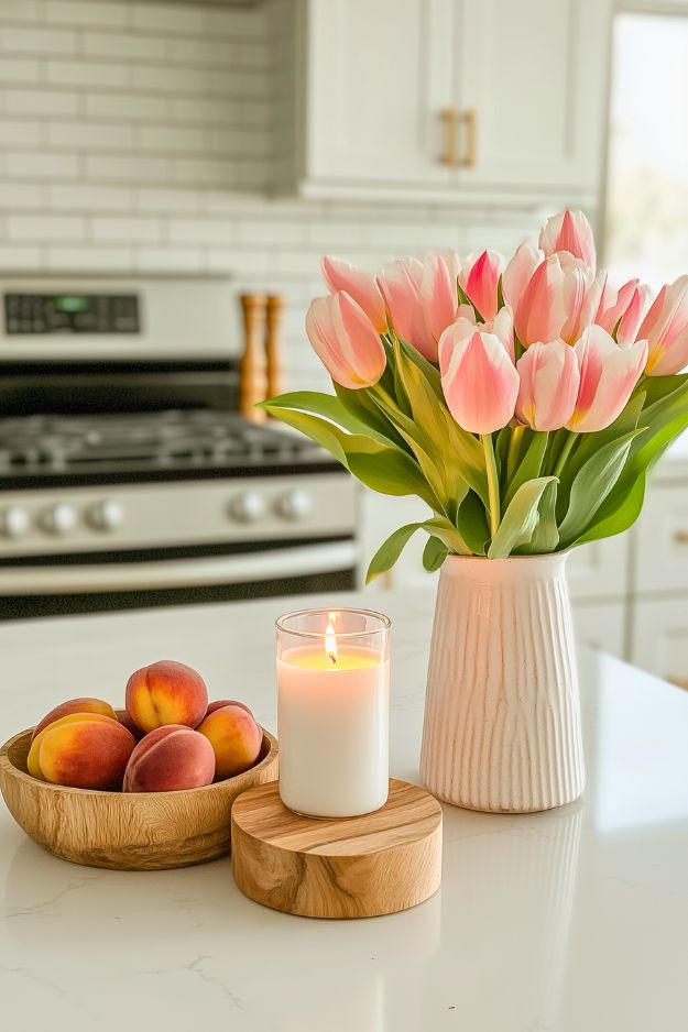 This kitchen setup is exactly my kind of modern. The soft pink tulips, a few peaches, and a candle are all it takes to make the space feel fresh and put-together without spending hours styling. It’s simple but still feels thoughtful, like the kind of decor you can throw together before guests come over and still get compliments.