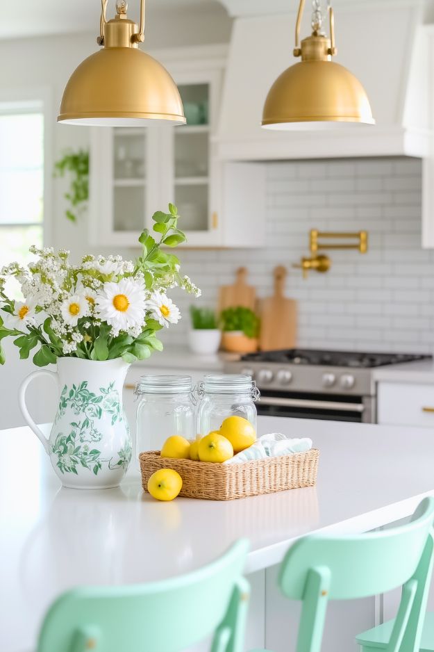 Look at how simple but refreshing this decor is. The floral pitcher, the basket of lemons, and those glass jars make it look styled but not staged, just naturally charming.