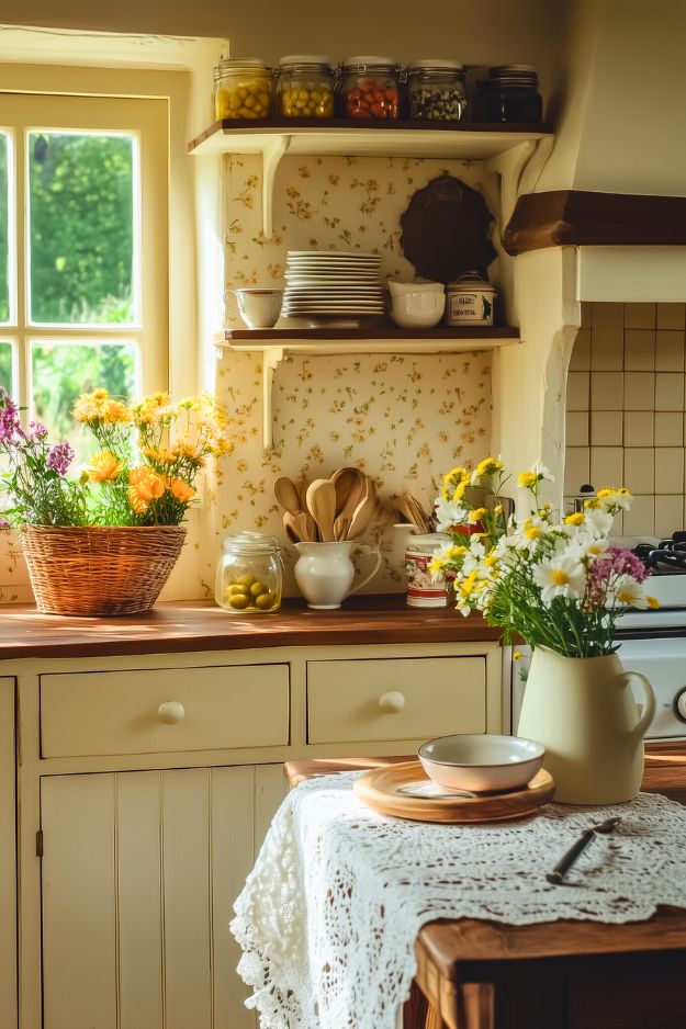 It’s honestly my dream to live in a little vintage cottage like this and bake sourdough every morning. I’m completely weak for this kind of aesthetic, the floral wallpaper, the open shelves lined with jars, the lace tablecloth, and all those wildflowers casually tucked into pitchers.