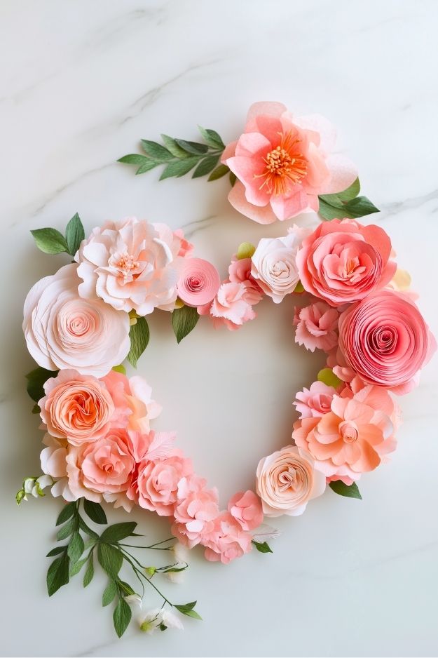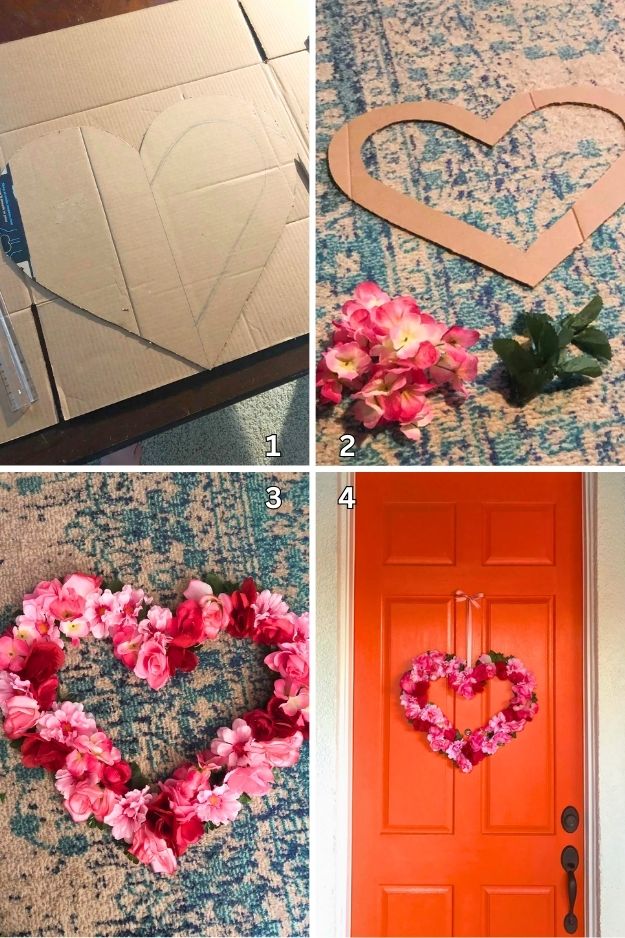 The construction is surprisingly simple too: a cardboard heart, hot-glued flowers, leaves tucked in to hide the gaps, and a ribbon secured with duct tape on the back. It’s the kind of easy craft that ends up looking way more polished than you’d expect.