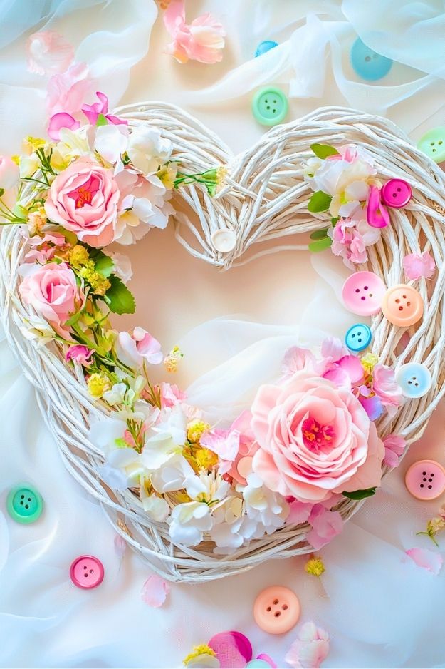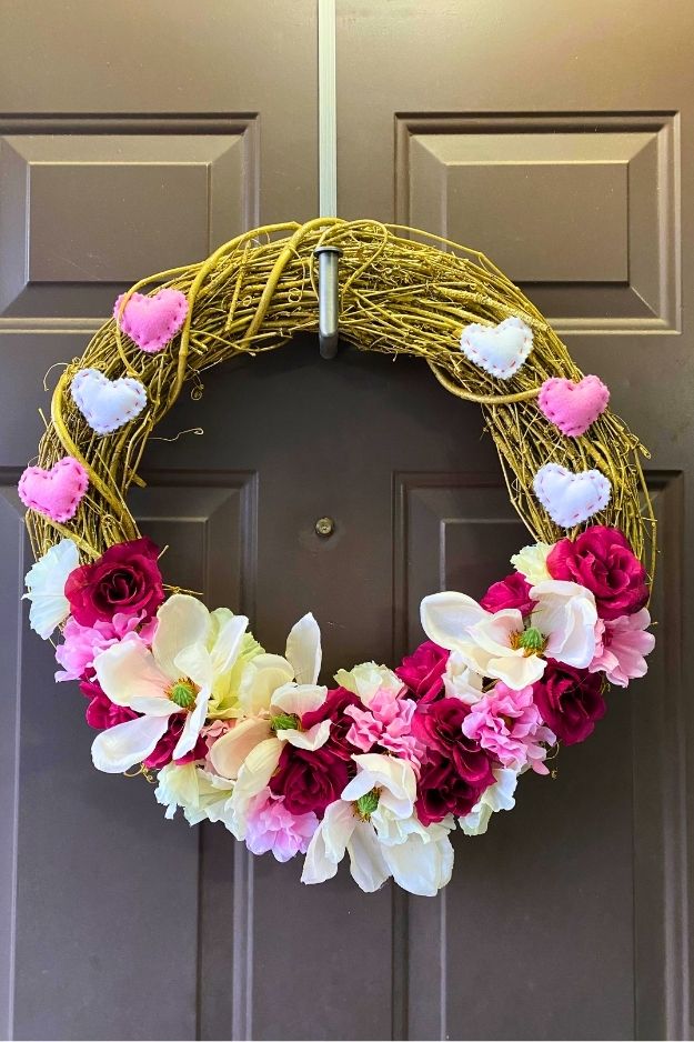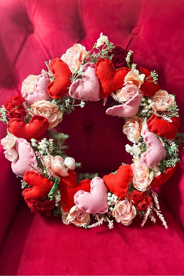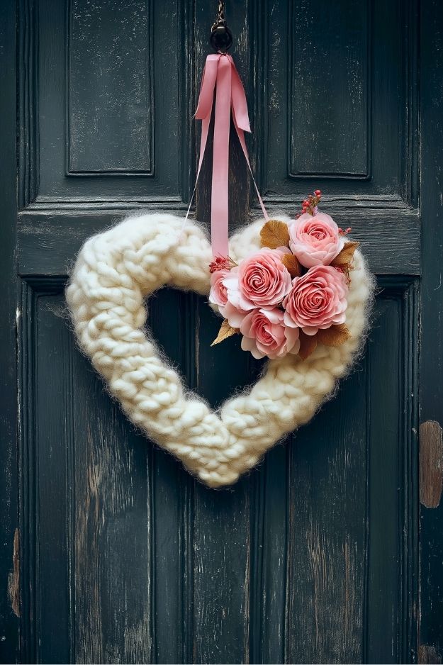 This felt wreath looks like the softest thing you could hang on a door, and I kind of love how cozy it feels without being fussy. The chunky knit texture gives it that warm, winter-y vibe, but the cluster of pink roses on the side brings in just enough sweetness for Valentine’s Day. I’m always surprised how something as simple as felt or chunky yarn can turn into a wreath that feels this pretty and handmade.